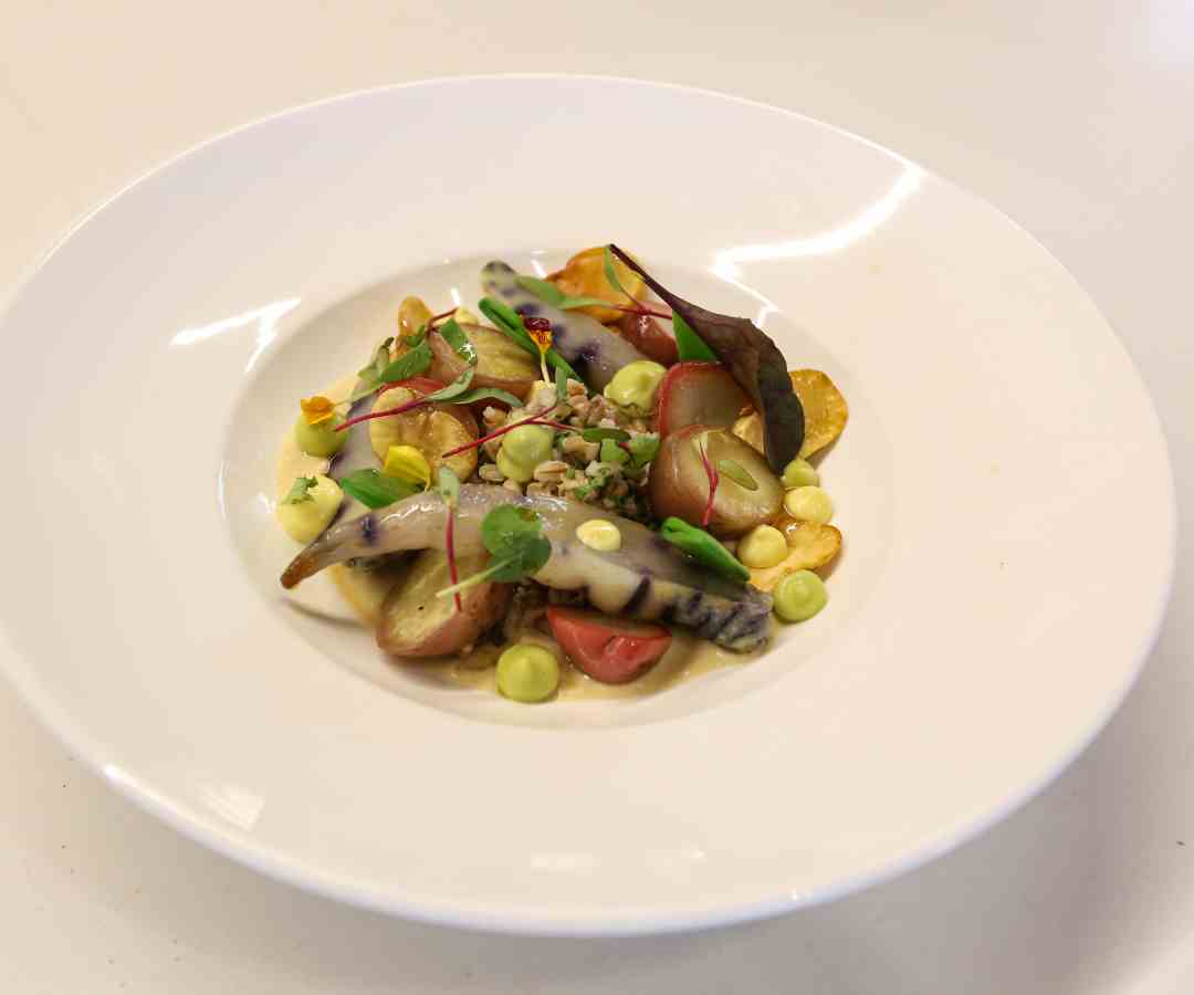 Ensalada de tubérculos andinos fríos con cubios, chuguas y papas sabaneras. El plato tiene una base de crema de garbanzos y se le adiciona cebada perlada. Todos los ingredientes están confitados en vinagre y miel.