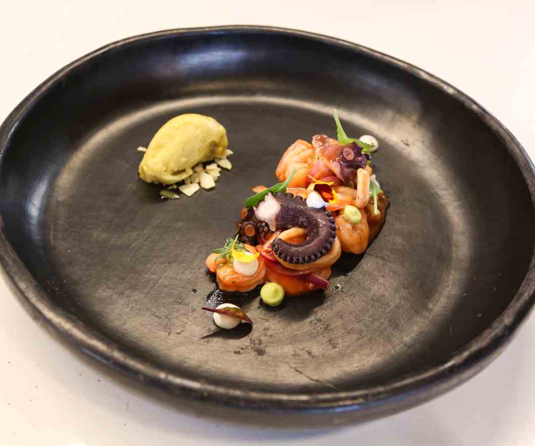 Ceviche tradicional con pulpo, camarones, cebolla y ajo. También viene acompañado con ingredientes hechos en casa como gel de coco, crema de aguacate y un helado salado hecho con pimienta rosada y lulo.