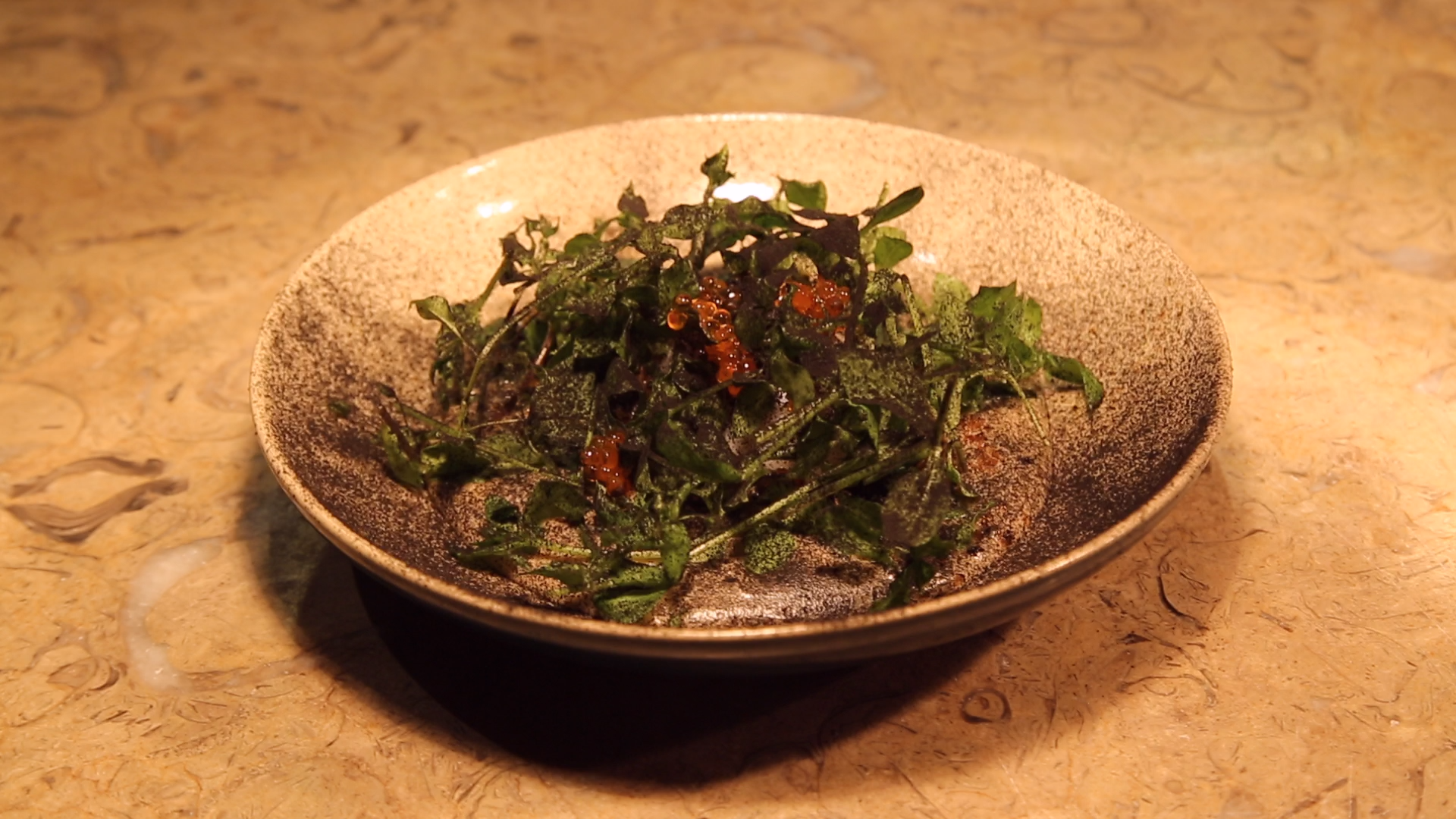 Caviar de trucha, huevo de pato, espuma de trucha ahumada y amaranto.