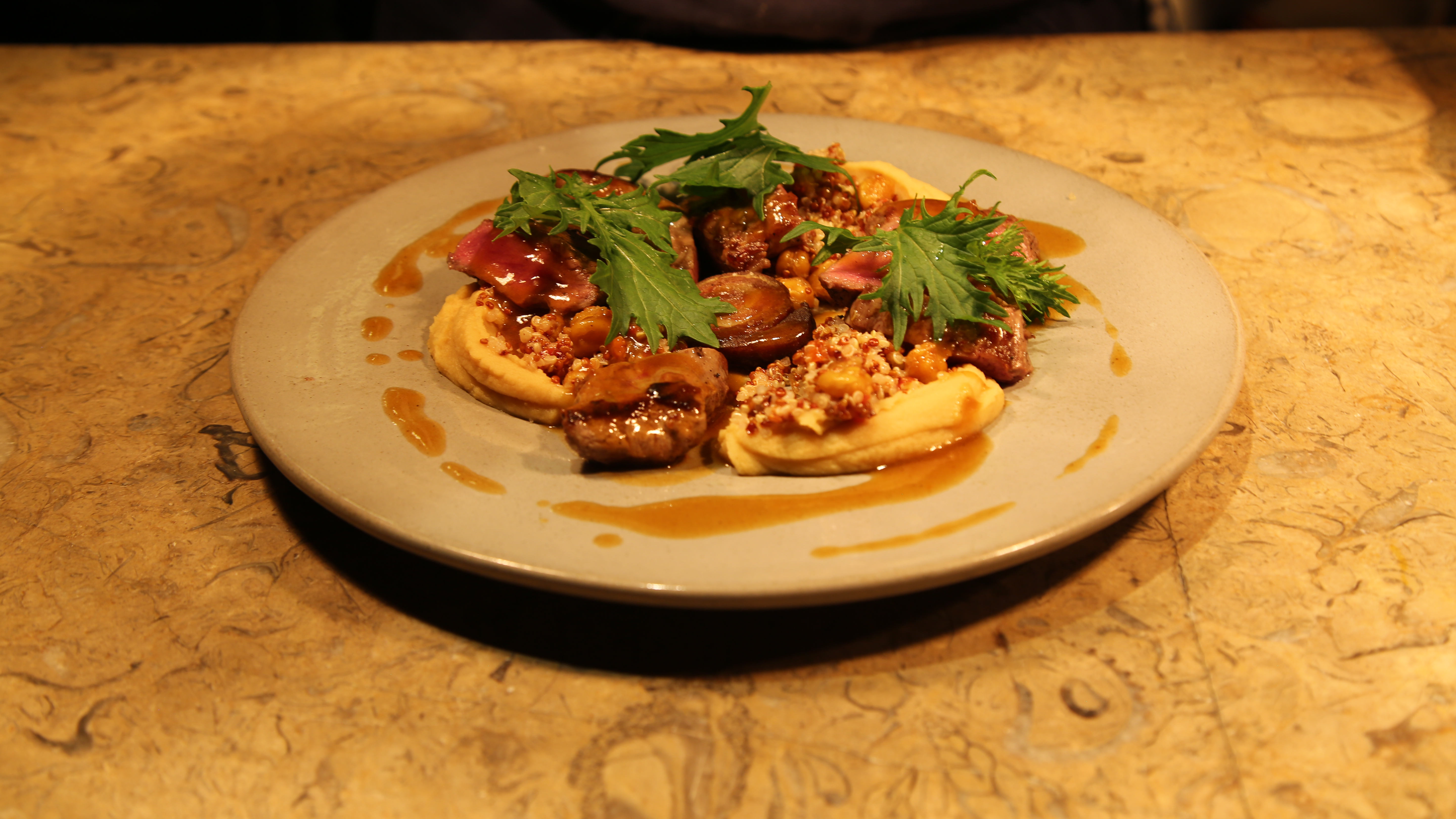 Viene acompañado de un puré de garbanzo y una ensalada de quínoa.