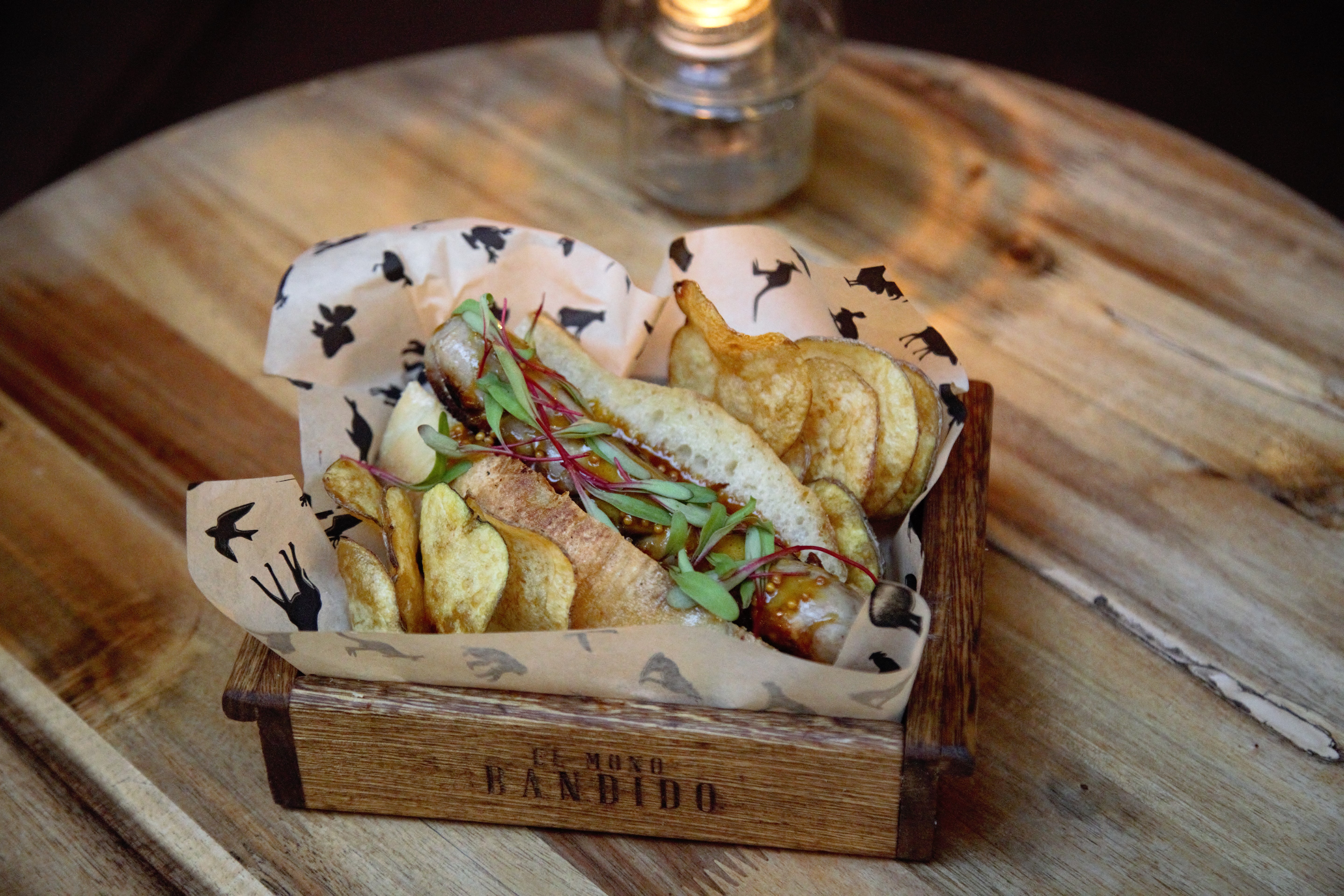 Una preparación con salchicha alemana Weißwurst a la que se le aplica una salsa mostaza de panela y cerveza. Además, el Hot Mono Alemán es servido con una porción de papas chips.