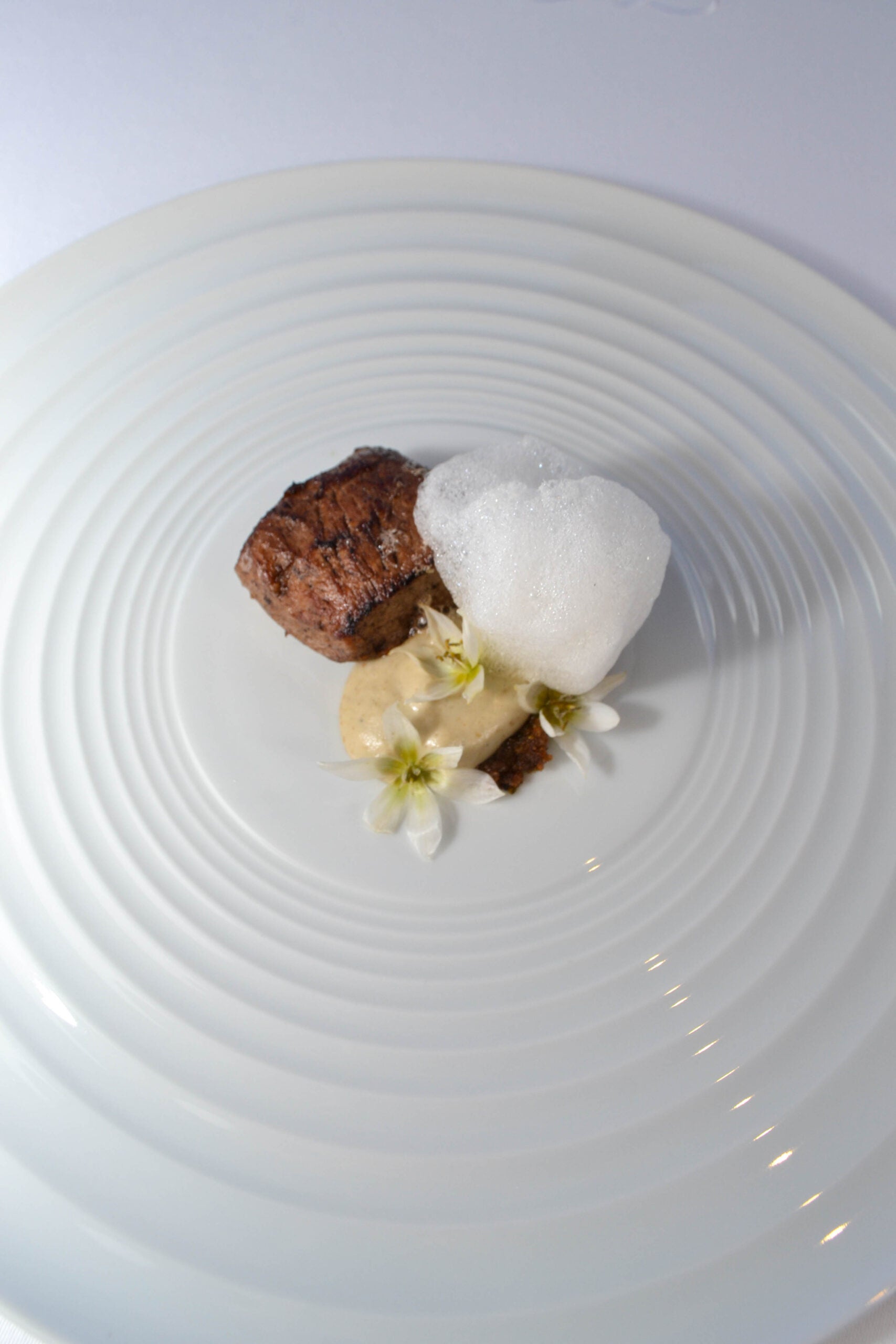 Este plato está inspirado en Turquía y tiene influencias de muchos países, por lo que crearon para este un puré de berenjena junto a un paté de dátiles característico del medio oriente. Encima el cordero insignia con una espuma de whisky ahumado.