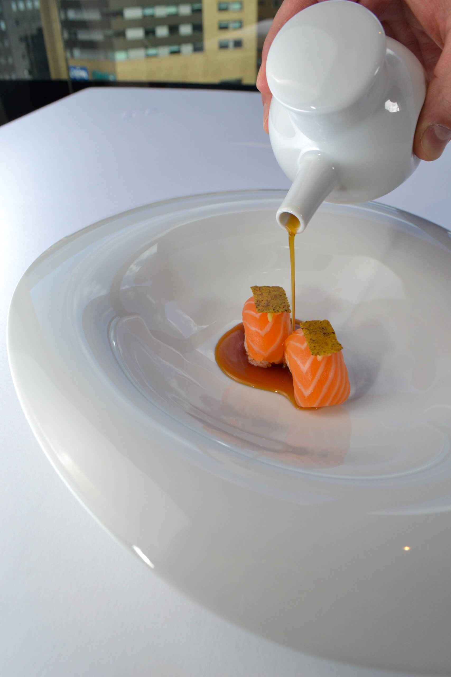 Para quienes no sean amantes de la carne y quieren probar otras opciones está el salmón ahumado. Inspirado en el minimalismo, lo esencial japonés, el salmón viene en una reducción de hongos y algas junto a un pepino melón, que se come de un solo bocado.
