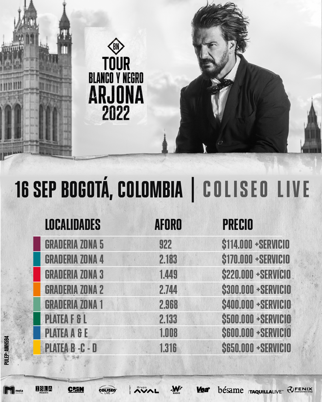 La venta de boletería estará abierta en Taquilla Live, con precios desde $114.000 sin servicio, hasta $650.000 sin servicio en platea. El evento hace parte de su tour 'Blanco y Negro', con lo que además de clásicos como 'Fuiste tú' o 'Historia de taxi', el cantante mostrará sus nuevas propuestas.