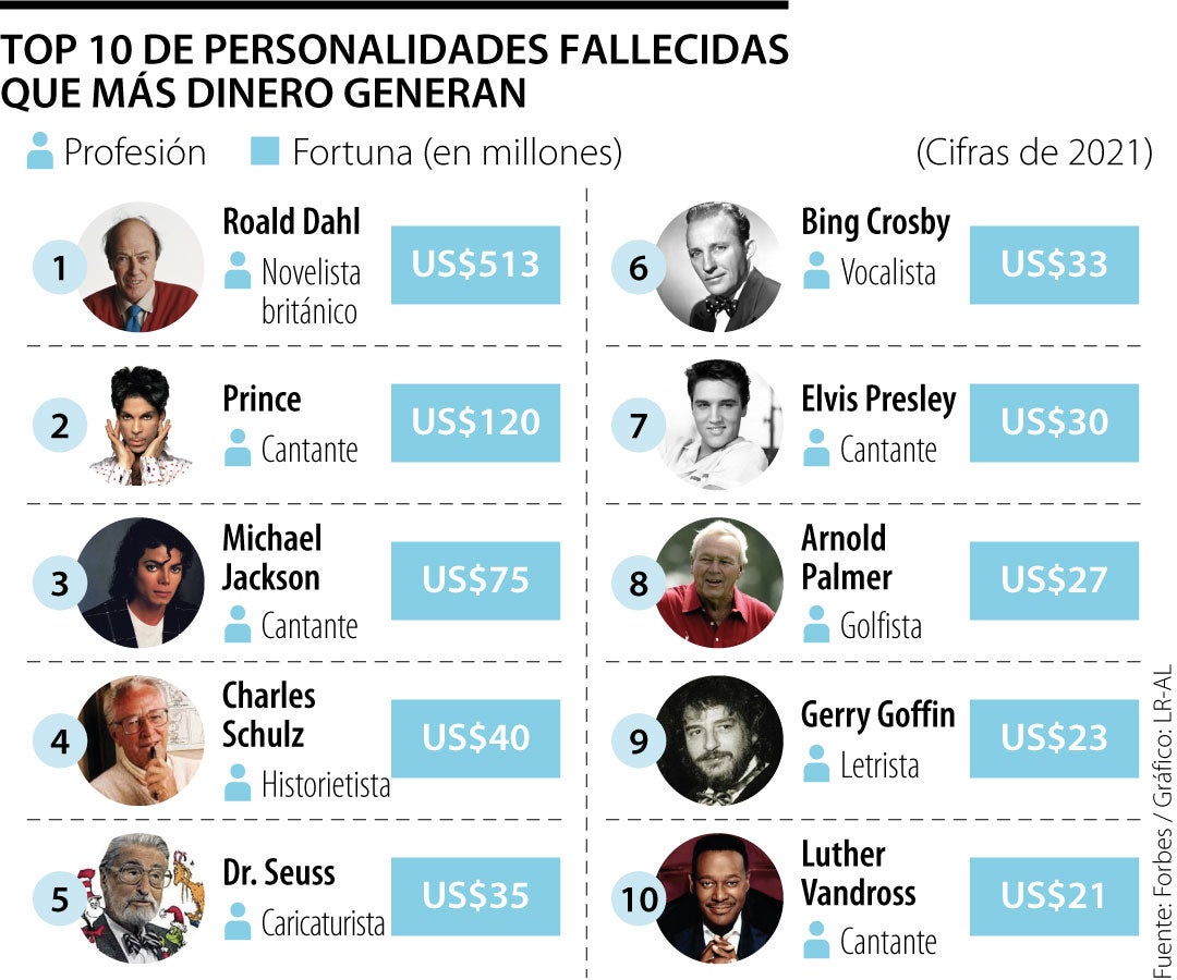 Bien sea porque sus obras son compradas para grandes productoras, para replicarlas o hacer los famosos remake, o porque su música sigue apareciendo en las películas del cine actual, artistas como Roald Dahl, Michael Jackson, Pince o Elvis Presley siguen liderado el top 10 de los artistas fallecidos que más ganancias generan.