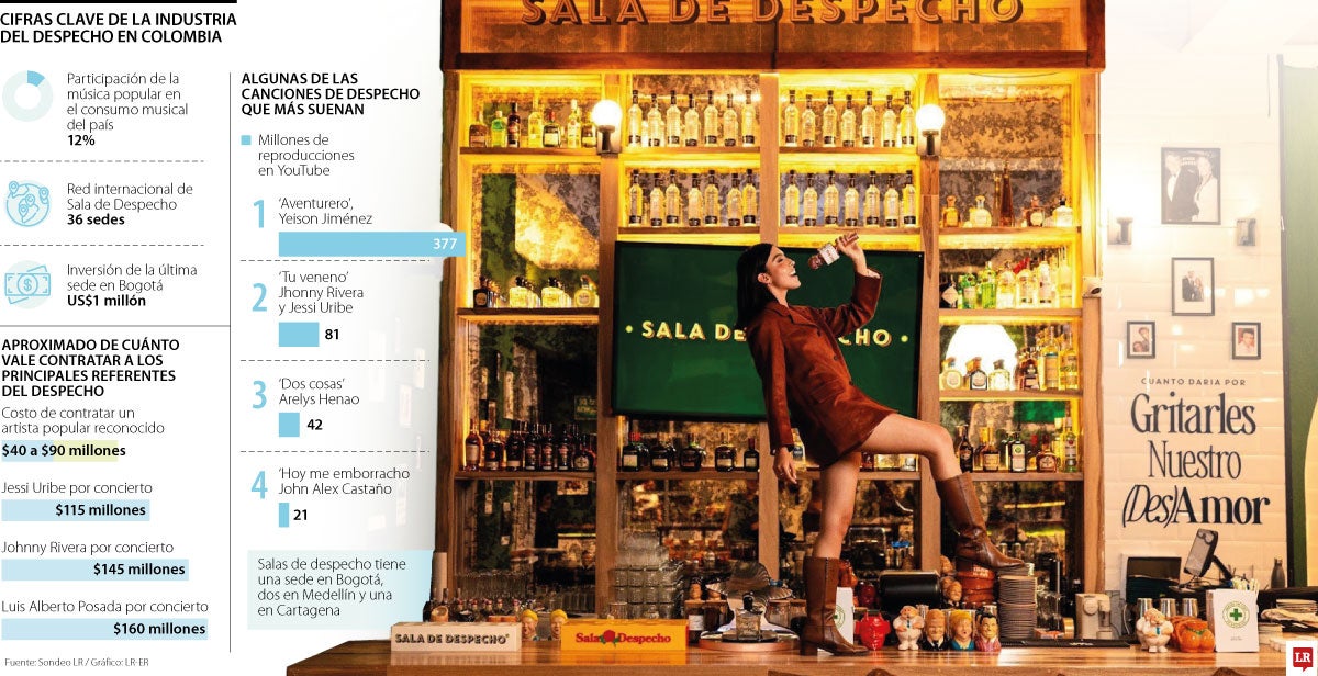 Es la expansión de formatos como las salas de despecho, que ya completan cuatro sedes en el país y se integran a una red internacional de 36 locales. Las cifras muestran el tamaño de la apuesta. Solo la nueva sede de Sala de Despecho en Bogotá implicó una inversión cercana a US$1 millón, con 35 empleos directos, 25 indirectos y una proyección de miles de asistentes por semana. Al mismo tiempo, la música popular, principal combustible de este negocio, representa cerca del 12% del consumo musical en Colombia.