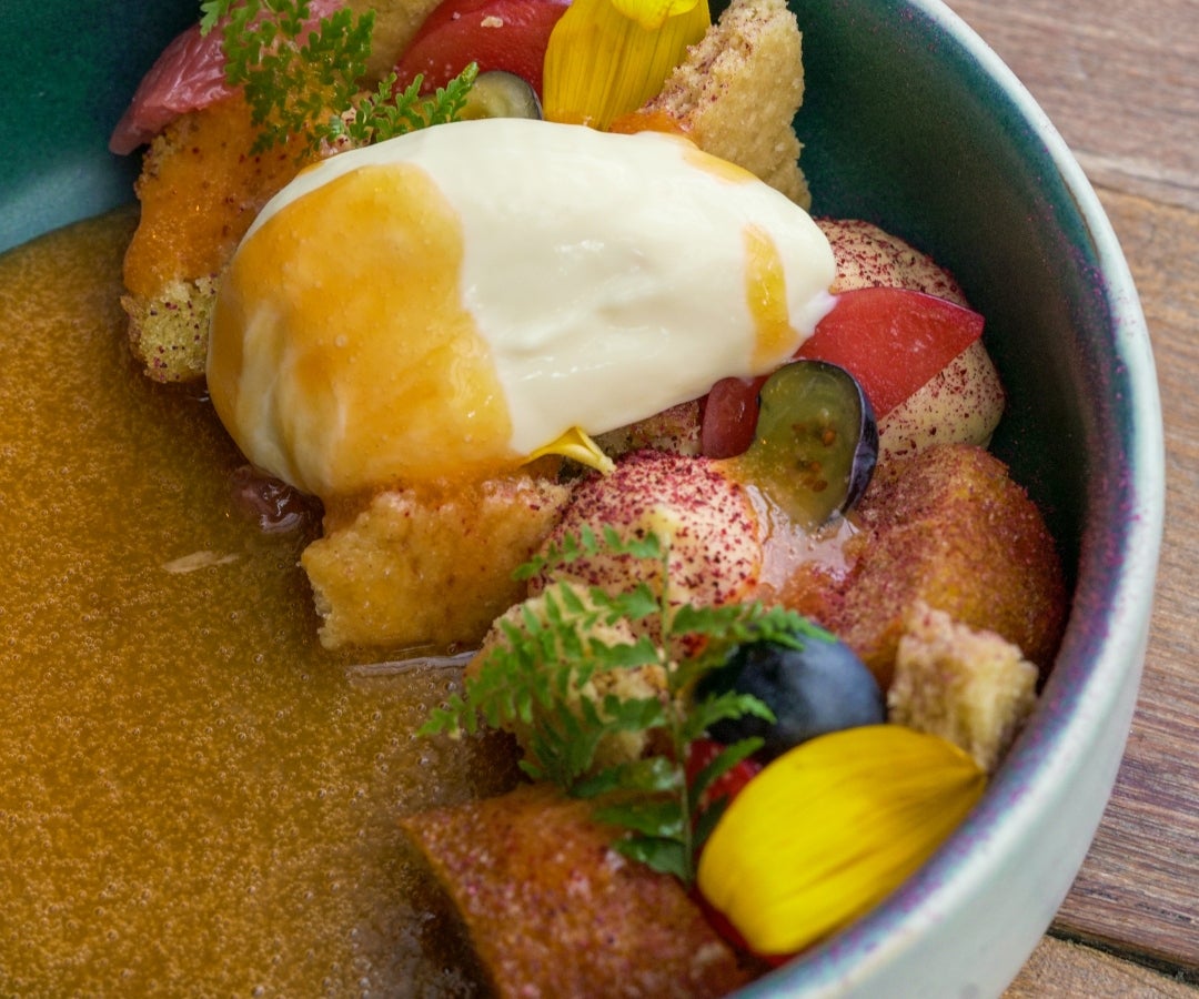 Yema curada, pan de masa madre, sauco encurtido y tuétano. Una entrada llena de la frescura y color, típica de un bistró francés, sin olvidar los elementos clave de la despensa colombiana.