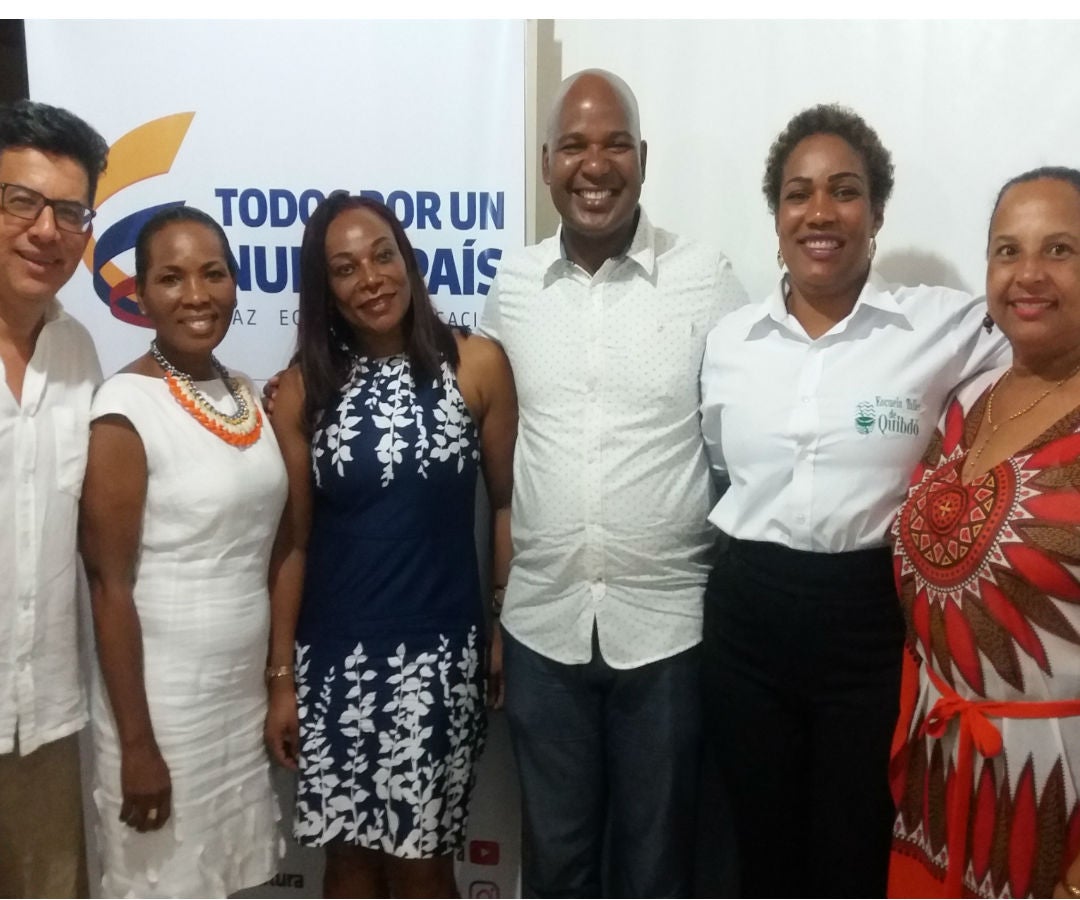 Carlos Albán, coor. Programa Escuelas Taller; Zulia Mena, Viceministra de Cultura; Elsa Pasella Delgado; Burny Lucas Perea, y Teresa Marina Ocha, de la junta directiva de la Escuela, y Yurleidy Cossio, directora de la Escuela.