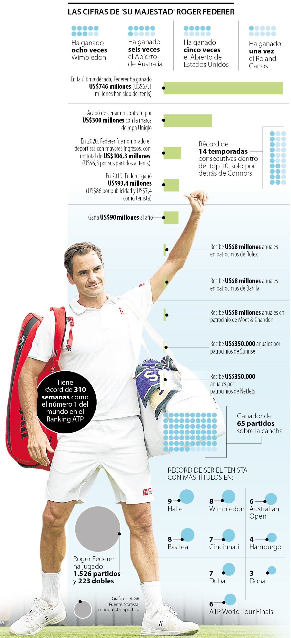 Federer es por mucho, el mejor pagado, el más patrocinado, y el tercer tenista que más competencias de Grand Slam ha ganado. El suizo se coronó ocho veces en Wimbledon, seis en el Abierto de Australia, cinco en el Abierto de Estados Unidos y una sola vez en el Roland Garros.
