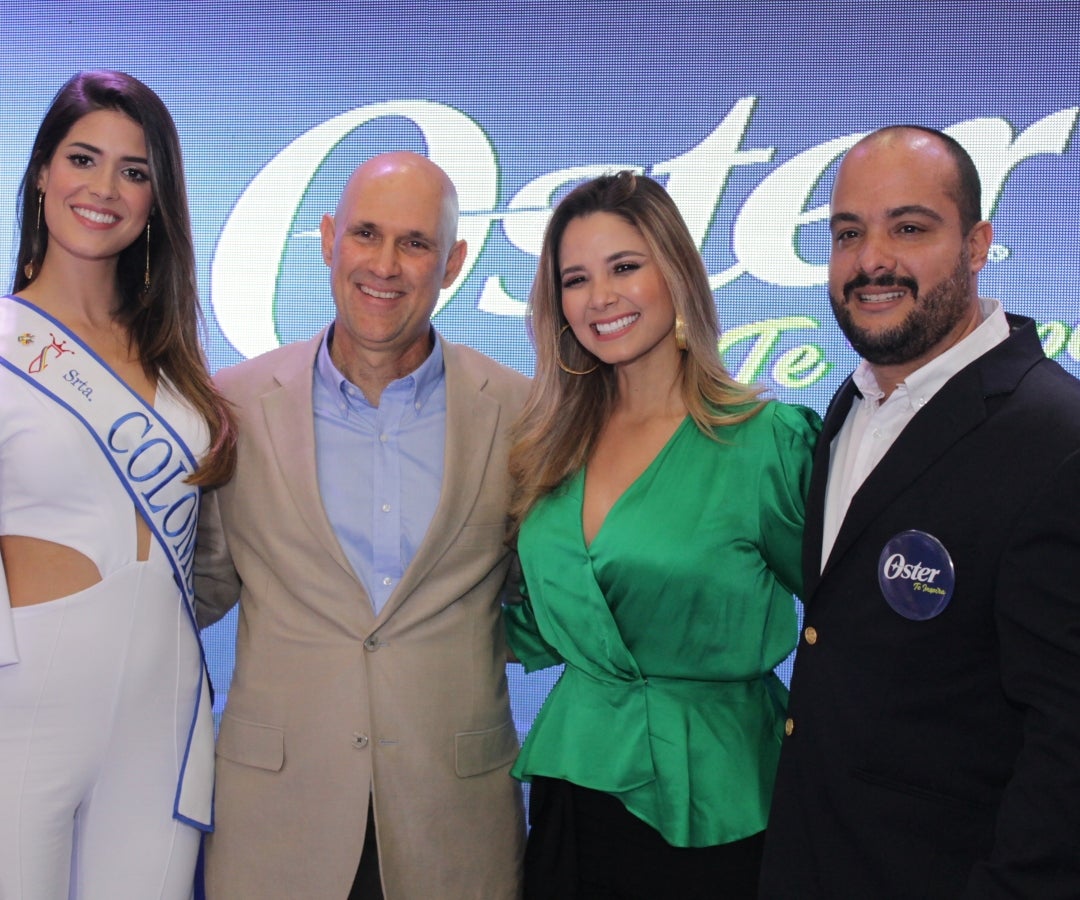 Gabriela Tafur, señorita Colombia;Felipe Gómez, gerente Oster Colombia;Melissa Martínez, presentadora del evento; y Alejandro Escobar, director of sales de Oster.