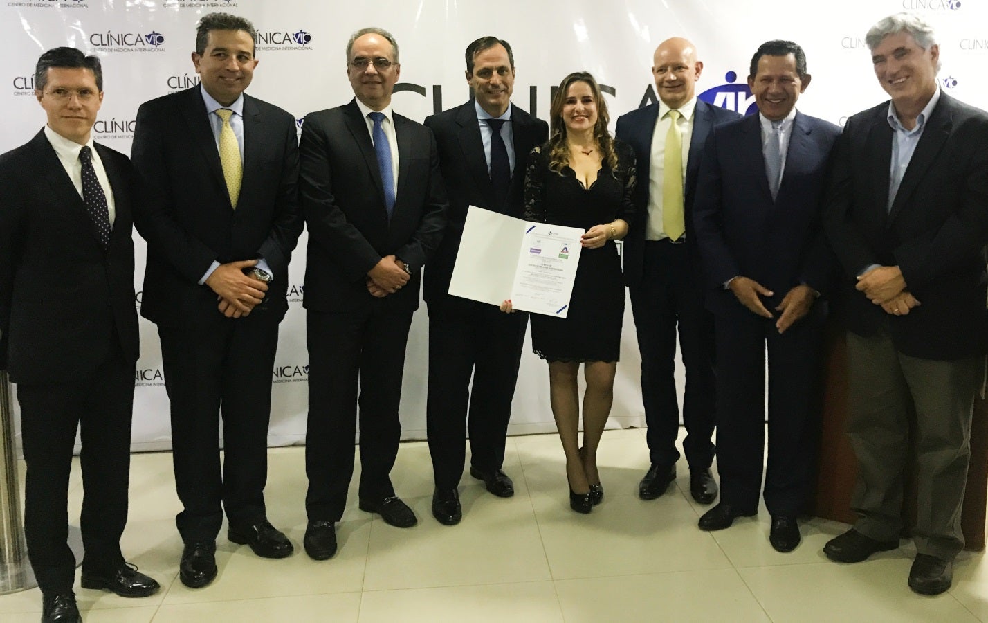Carlos Édgar Rodríguez, rector Nacional de Acreditación en Salud de Icontec; Juan Guillermo Zuloaga, director líneas de Capital humano AXA Colpatria; Bernardo Serrano, CEO AXA Colpatria; Catherine Moncayo, directora Calidad Clínica VIP; Fernando Ortíz, gerente Clínica VIP; Eduardo Pacheco, presidente Grupo Mercantil Colpatria; y Juan Pablo Uribe, Ministro de Salud.