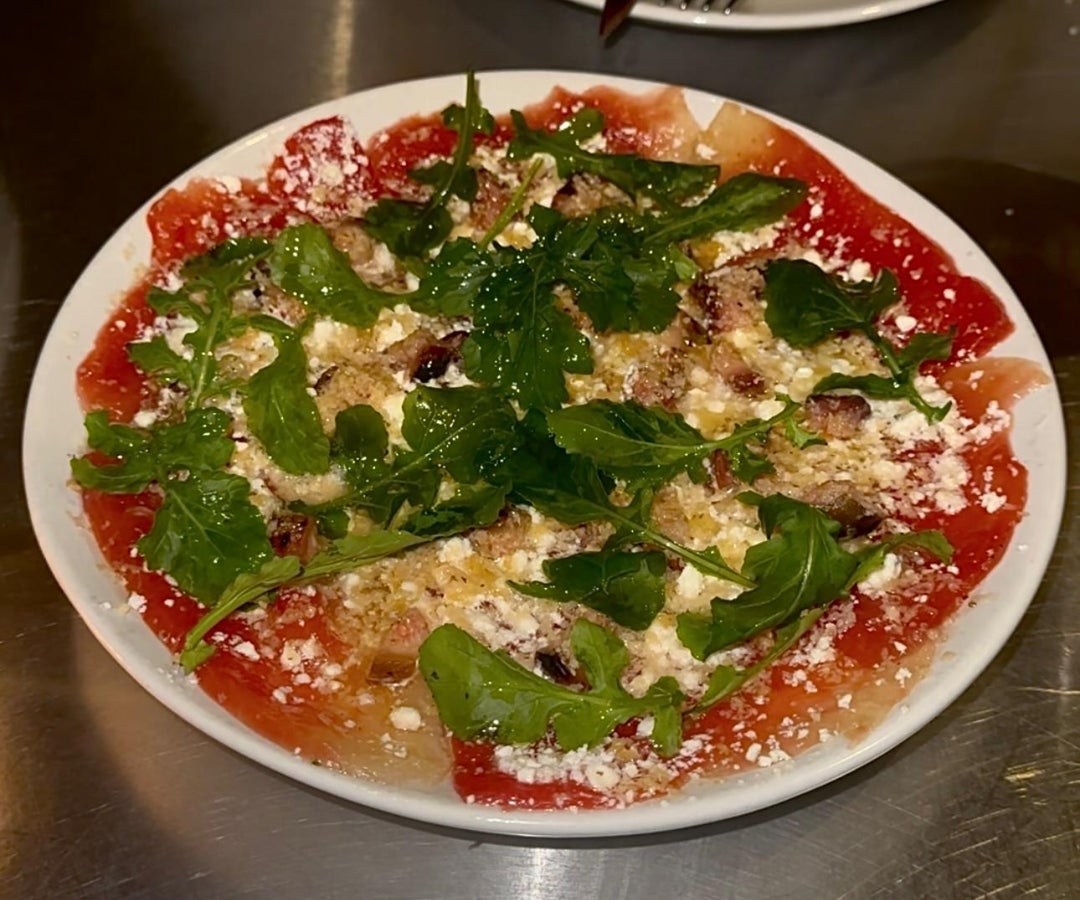Este innovador plato consiste en sandía cocinada por 24 horas y ahumada con heno, servida con queso feta, nueces brasileñas ralladas, higos frescos y rúgula. La combinación ofrece una frescura perfecta para iniciar la experiencia.