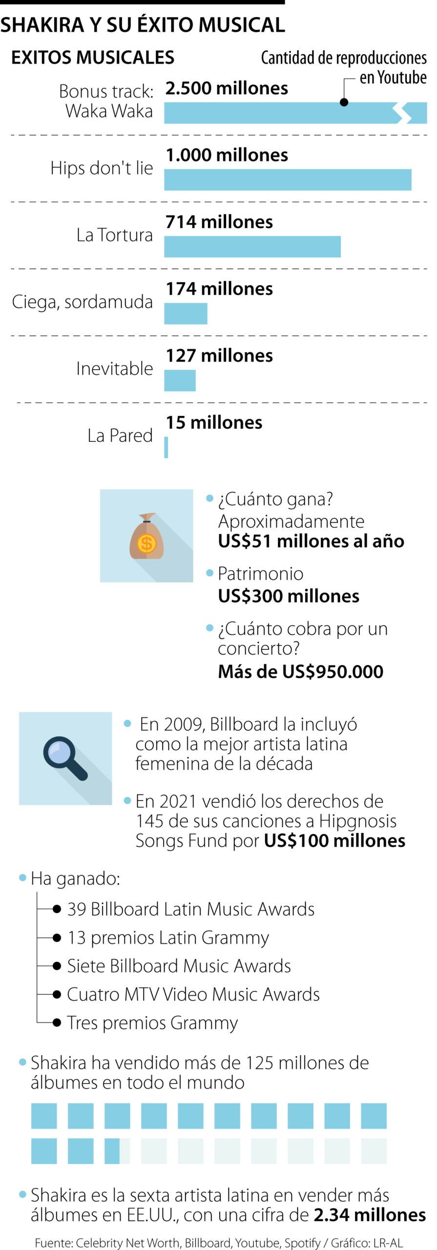 La barranquillera también hace peso en la industria musical. Según Celetribity Net Worth, Shakira factura más de US$51 millones al año, por lo que su patrimonio neto actual llega a la cifra de los US$300 millones. Además, es la sexta cantante latinoamericana en vender más álbumes en EE.UU., con un total de 2,3 millones vendidos.