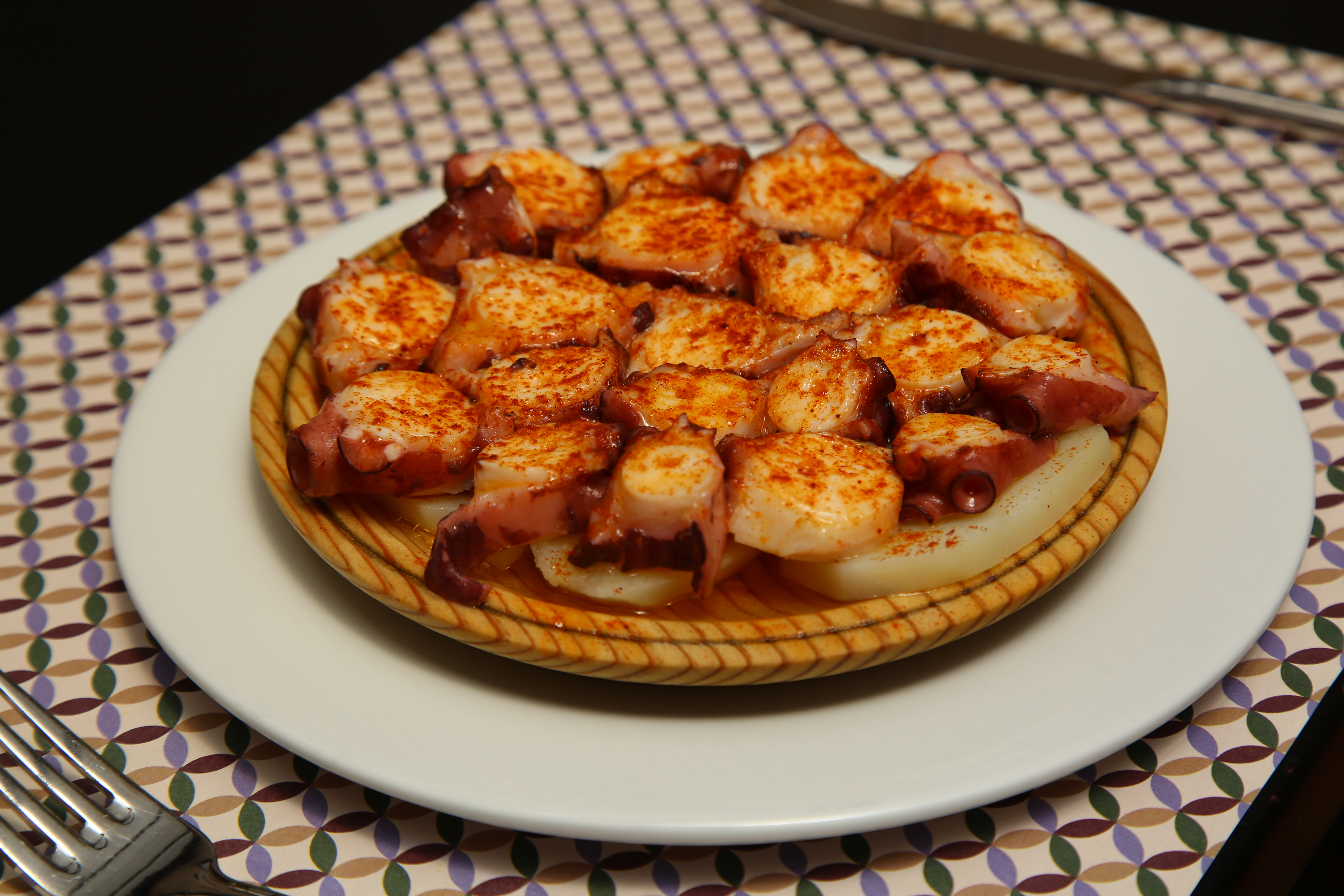 Pulpo cocido cortado en rodajas, espolvoreado con pimentón, sal gruesa y aceite de oliva.