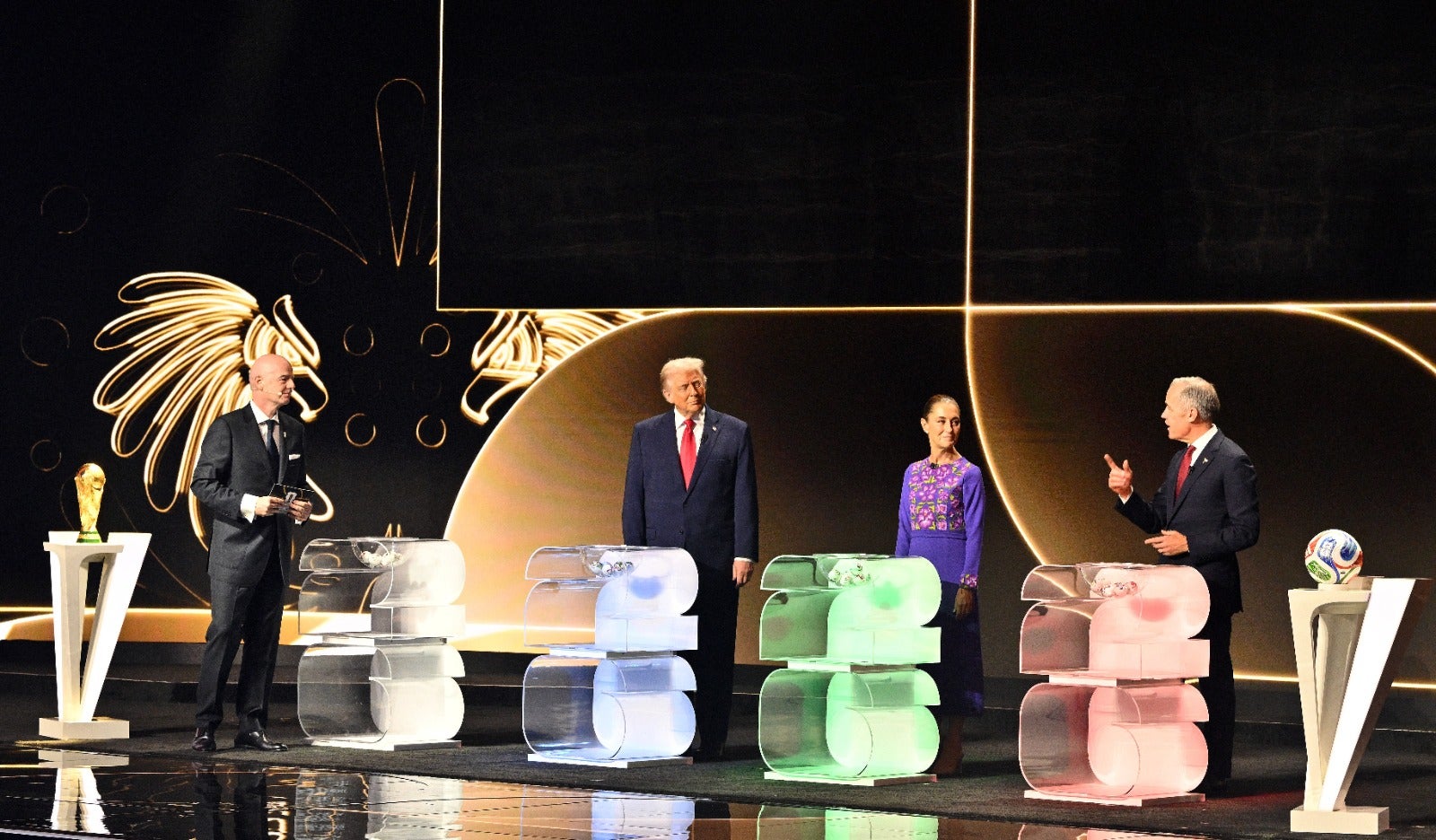 En el sorteo de la fase de grupos del Mundial se encuentran personalidades como Donald Trump, presidente de Estados Unidos, la presidente de México, Claudia Sheinbaum, y el primer ministro de Canadá, Mark Carney. Además de otras personalidades como Andrea Bochelli y Robbie Williams, quienes tuvieron presentaciones durante el evento.