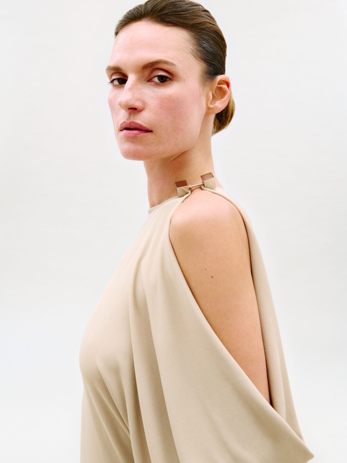 Con la modernidad y atemporalidad, la colección cuenta con siluetas pensadas para fluir sin perder estructura. Las prendas apuestan por el drapeado suave del jersey de seda, combinado con un tailoring definido, logrando una estética pulida y naturalmente ligera. La narrativa de los colores acompaña el concepto con una paleta que recuerda la puesta de sol en el horizonte de un desierto: burnt orange, ámbar y terracota dominan la escena aportando calidez.
