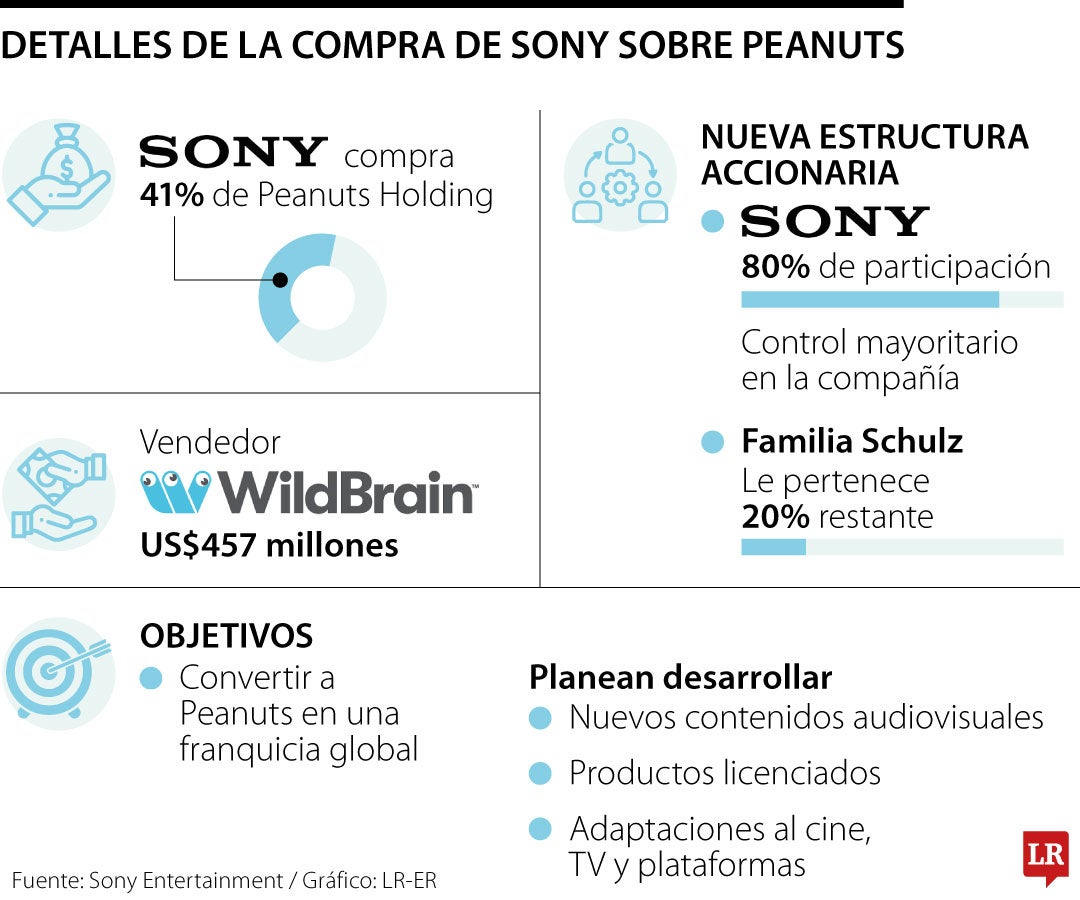 Después de la celebración de los 75 años de la creación de las historietas de Peanuts el pasado 2 de octubre, la japonesa Sony Pictures Entertainment y Sony Music Entertainment Japón, con la salida con la canadiense Wildbrain, acordaron la compra de cerca de 39% de su participación en Peanuts Holdings LLC, la marca dueña de los icónicos personajes Charlie Brown y Snoopy. La adquisición está valorada por US$457 millones.