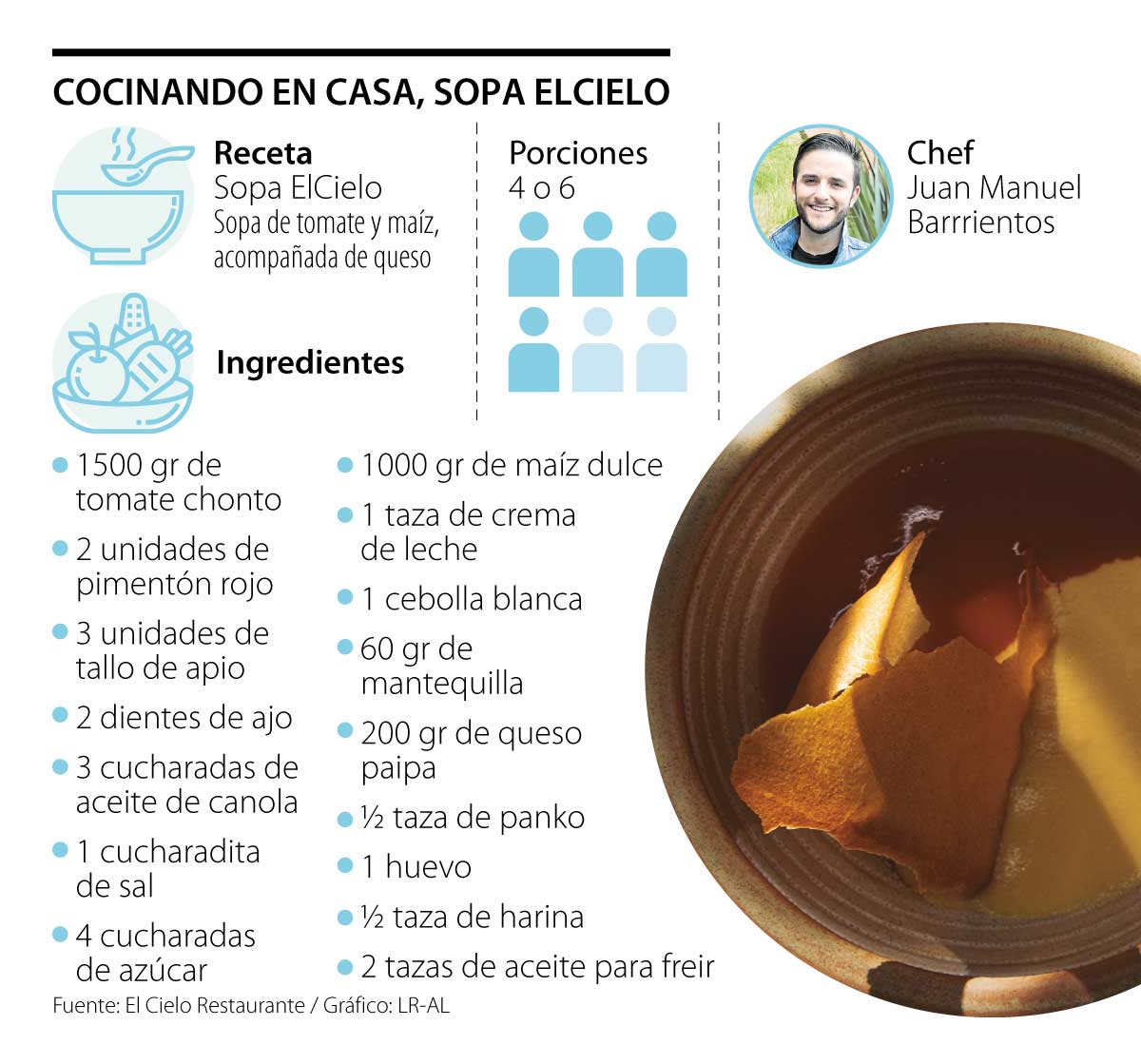 En época de aislamiento cocinar es uno de los mejores planes y el chef colombiano Juan Manuel Barrientos, dueño de uno de El Cielo, compartió una de sus recetas. Se trata de una sopa de tomate y maíz, acompañada de queso que representa el fuego y la luz de los volcanes. Aquellas explosiones y destellos luminosos que se dieron en la formación del planeta. La receta aún hace parte de la carta oficial del restaurante El Cielo.
