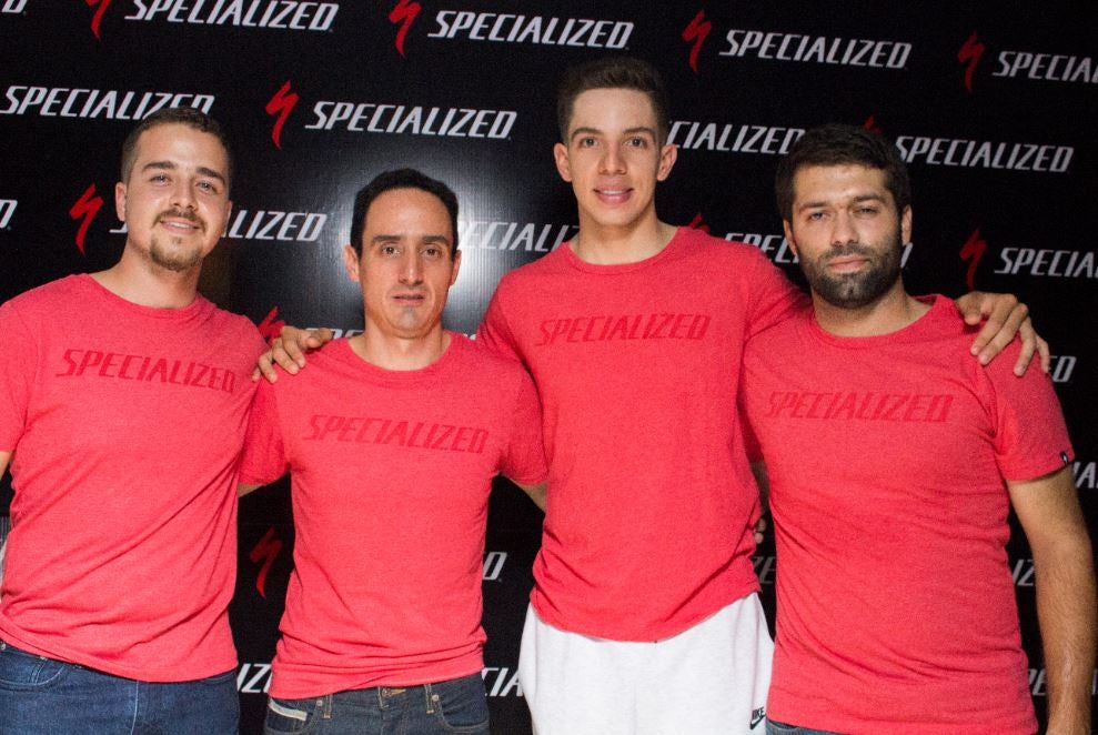 Carlos Cardona, anfitrión tienda Specialized Montería; Pablo Restrepo, director Comercial de Specialized; Álvaro Hodeg, ciclista profesional monteriano; y Tomás Gaviria, anfitrión de la tienda Specialized Montería.