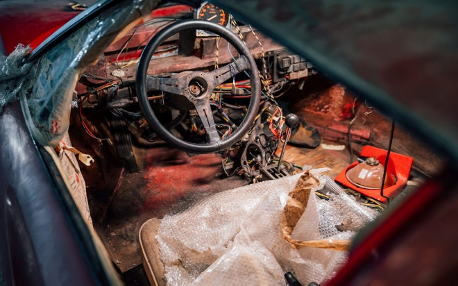 El estilo musculoso del 308 GTSi descapotable de 214 CV se combina con la inyección de combustible Bosch K-Jetronic. El modelo fue vendido en Bélgica con acabado en Rosso Chiaro en 1982 con tapicería de cuero beige y perteneció a la Colección Baillon, una increíble agrupación de autos descubierta en un granero francés en 2014, propiedad de Roger Baillon, un empresario dedicado al transporte que consiguió reunir la impresionante colección con la idea de montar un museo del automóvil y que posteriormente fue adquirido por Petitjean en 2015, quien los ha mantenido almacenado en una cámara de aire ventilada para preservar la originalidad.