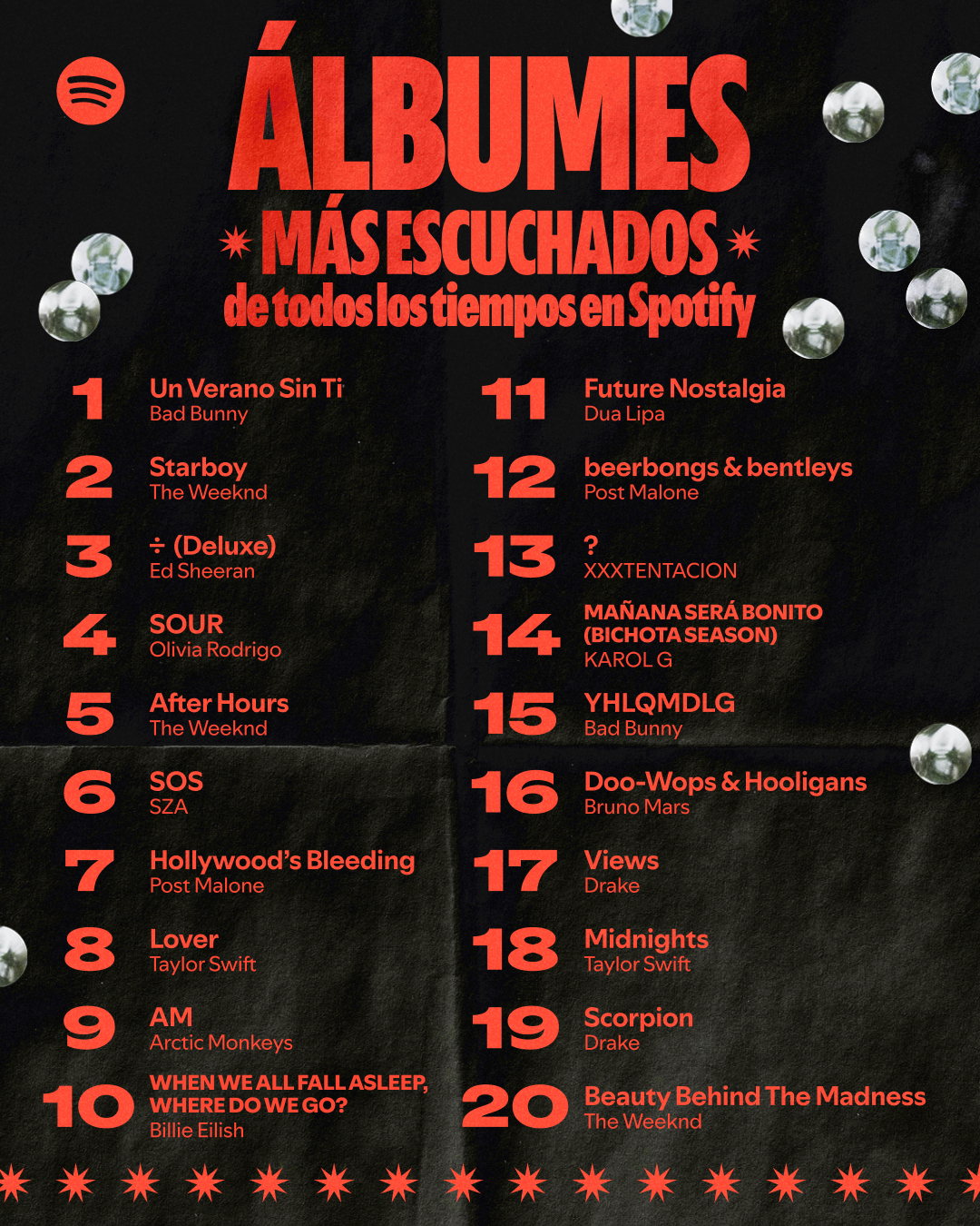 En cuanto a los álbumes más escuchados de todos los tiempos, el primer lugar lo ocupa 'Un verano sin ti' de Bad Bunny, seguido por 'Starboy' de The Weeknd y '÷ (Divide)' de Ed Sheeran. También figuran 'Sour' de Olivia Rodrigo, 'After Hours' de The Weeknd, 'SOS' de SZA y 'Mañana será bonito de Karol G', que se suma como uno de los fenómenos recientes más relevantes del mercado latino y es la primera colombiana en este listado de los álbumes.