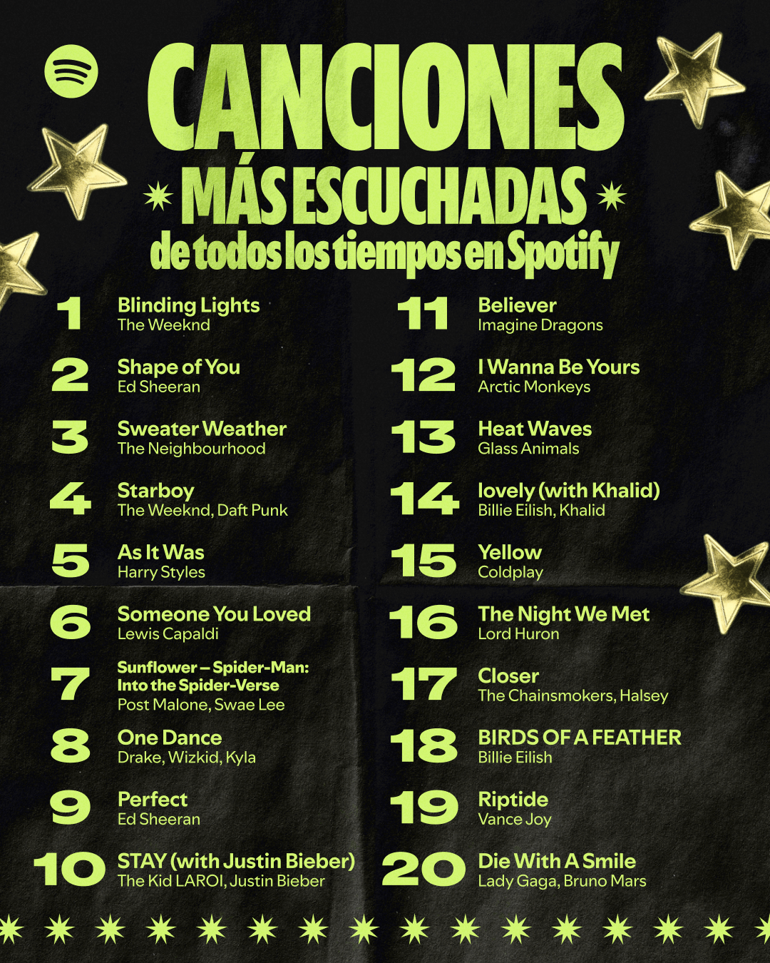 También aparecen nombres como Travis Scott, BTS, Post Malone, Bruno Mars, J Balvin, Rihanna, Coldplay, Kendrick Lamar, Future y Juice WRLD, lo que evidencia la diversidad de géneros y escenas musicales que han marcado la era del streaming.