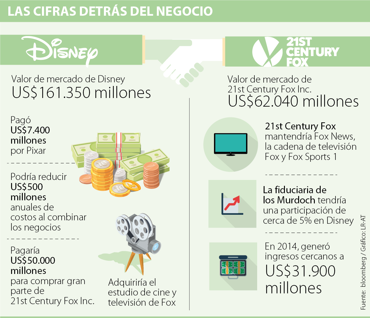 Luego de que hace tres meses se aclararan los rumores de que Walt Disney Co estaba interesado por la compra de la productora de cine y televisión Twenty-First Century Fox Inc, se conoció que la compañía del ratón ya tiene un acuerdo por US$52.400 millones en acciones. Los activos de Fox que se venderán a Disney incluyen películas de la marca y redes de cable.