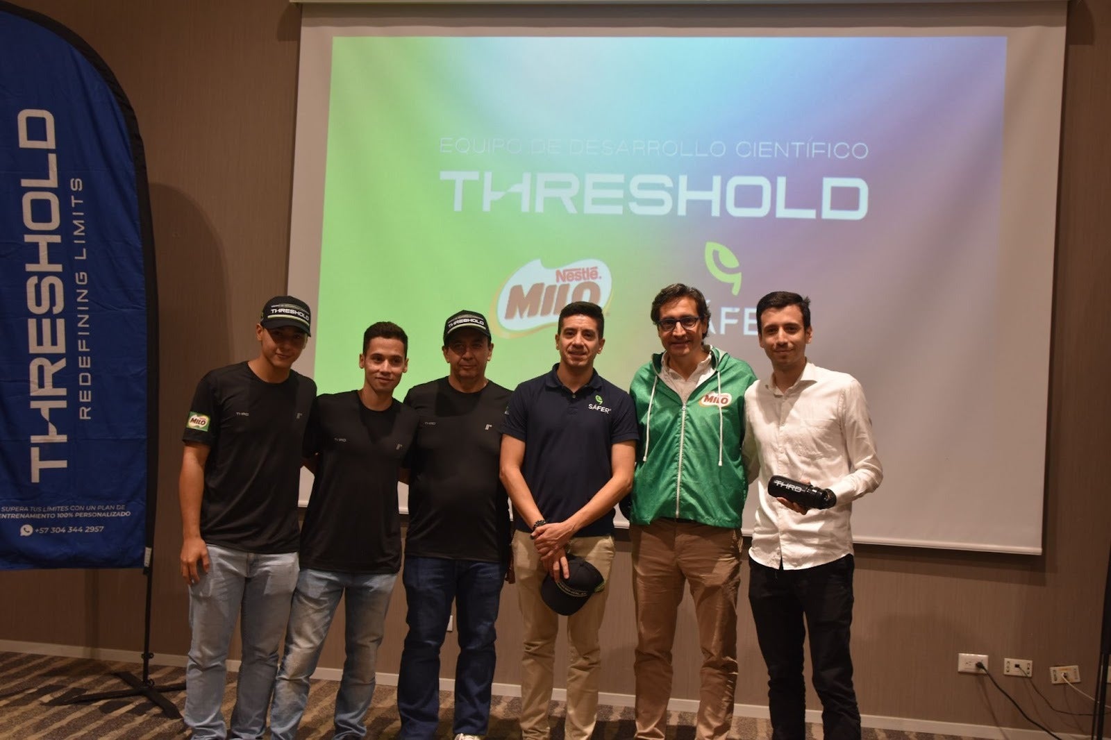 Juan Pablo Jaramillo, subdirector del equipo; Juan Guillermo Jaramillo, director general del equipo; Jhon Mario Jaramillo, gerente del equipo; Juan Carlos Cardona, gerente de Safer; Carlos Madriñán, director de negocios de bebidas achocolatadas de Nestlé®; y Pablo Pulido Ibarra, director de Threshold Experts.