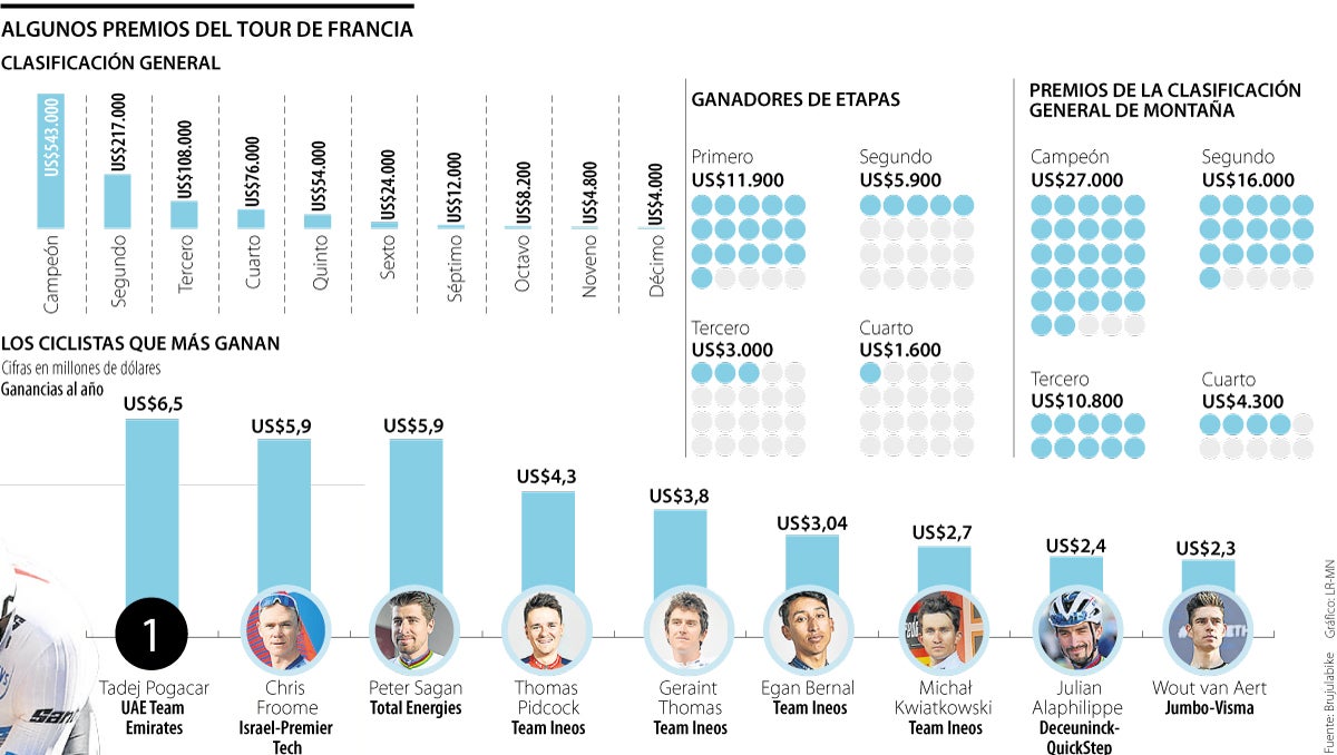 Para este año, el Tour de Francia entregará un total US$2,8 millones en premios para sus diferentes clasificaciones, además de la general y la de los ganadores de las etapas, US$327,390 más que lo que entregó el año anterior.
