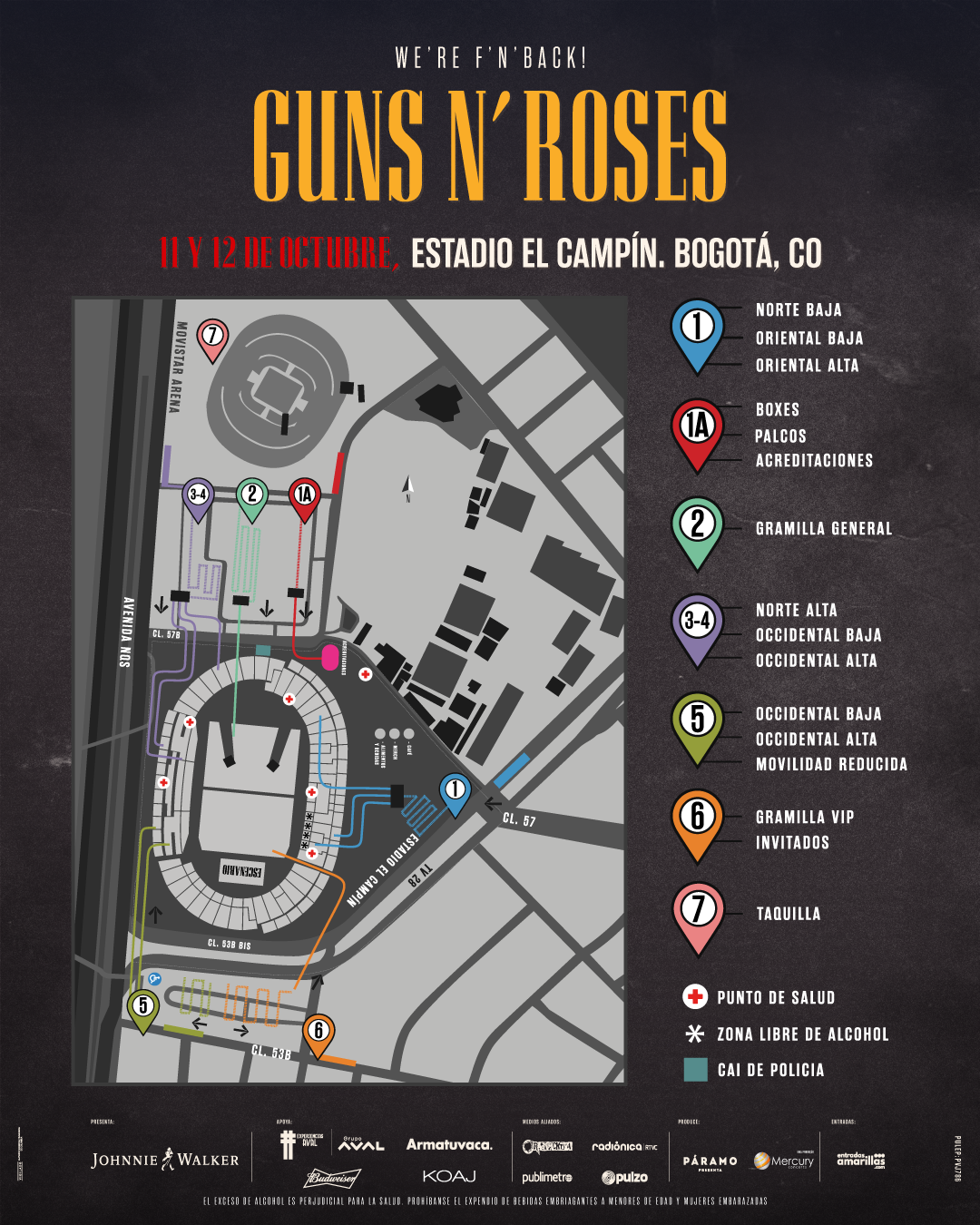Bogotá recibirá este martes 11 y miércoles 12 a la icónica banda de rock Guns N' Roses en el estadio El Campín, por lo que se espera un aproximado de 80.000 asistentes entre los dos días del evento. El show, en lo que el escenario abre puertas desde las 4:00 p.m., tendrá rutas de Transmilenio en estaciones aledañas al estadio hasta más de las 11:00 p.m.