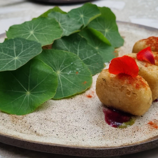 Sus platos recomendados son los raviolis con harina de remolacha, queso feta de almendras que son servidos en una cama de pesto y vienen acompañados por un buen pan de masa madre. A la primera mordida el queso explota en la boca y sumado al dulzor que le provee el pesto, el plato se equilibra.