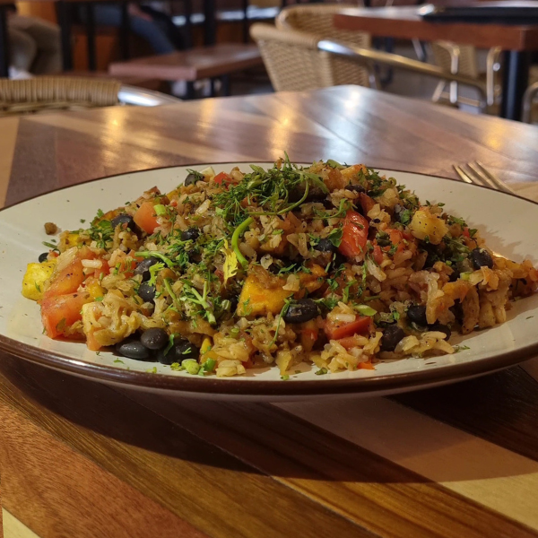 El arroz criollo es uno de los más pedidos en el restaurante y es que su mezcla de plátano maduro, tomate, frijol negro, hogao y seitán desmechado tienen un sabor que solo podría ser comprendido como una confort food. Un plato que recuerda al hogar. Una porción generosa que va acompañada de recuerdos y responsabilidad ambiental.