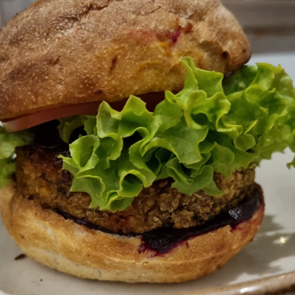 La hamburguesa de la casa es prácticamente una insignia del lugar, tanto así que se ofrece la "carne" de la hamburguesa (hecha con quinua y setas) para que los comensales puedan llevársela a su casa para inventar sus propias recetas. Su pan es crujiente, lleva queso de almendras y las cebollas caramelizadas le dan un ligero dulzor que acompaña perfectamente el platillo.