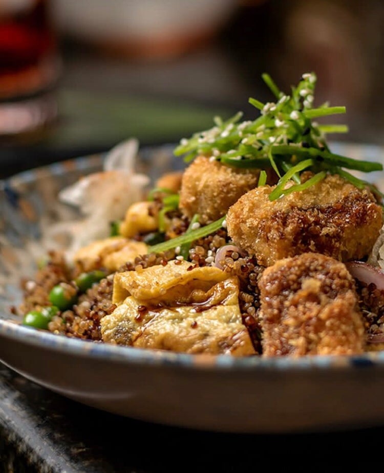 Para una opción más veggie, la quinoa chaufa es un excelente plato con tofu crocante, shiitakes y espárragos salteados, una combinación de vegetales y proteínas preparadas.