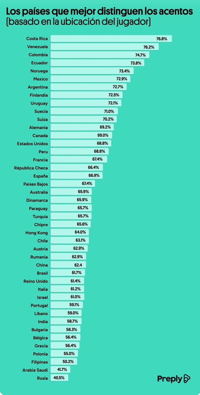 El estudio también reveló cuáles son los países con mejor capacidad para identificar acentos: Costa Rica, Venezuela, Colombia, Ecuador y Noruega. Este último caso llamó la atención porque supera a naciones tradicionalmente hispanohablantes como México y Argentina, y se suma a otros países nórdicos como Finlandia y Suecia, que también aparecen bien posicionados.