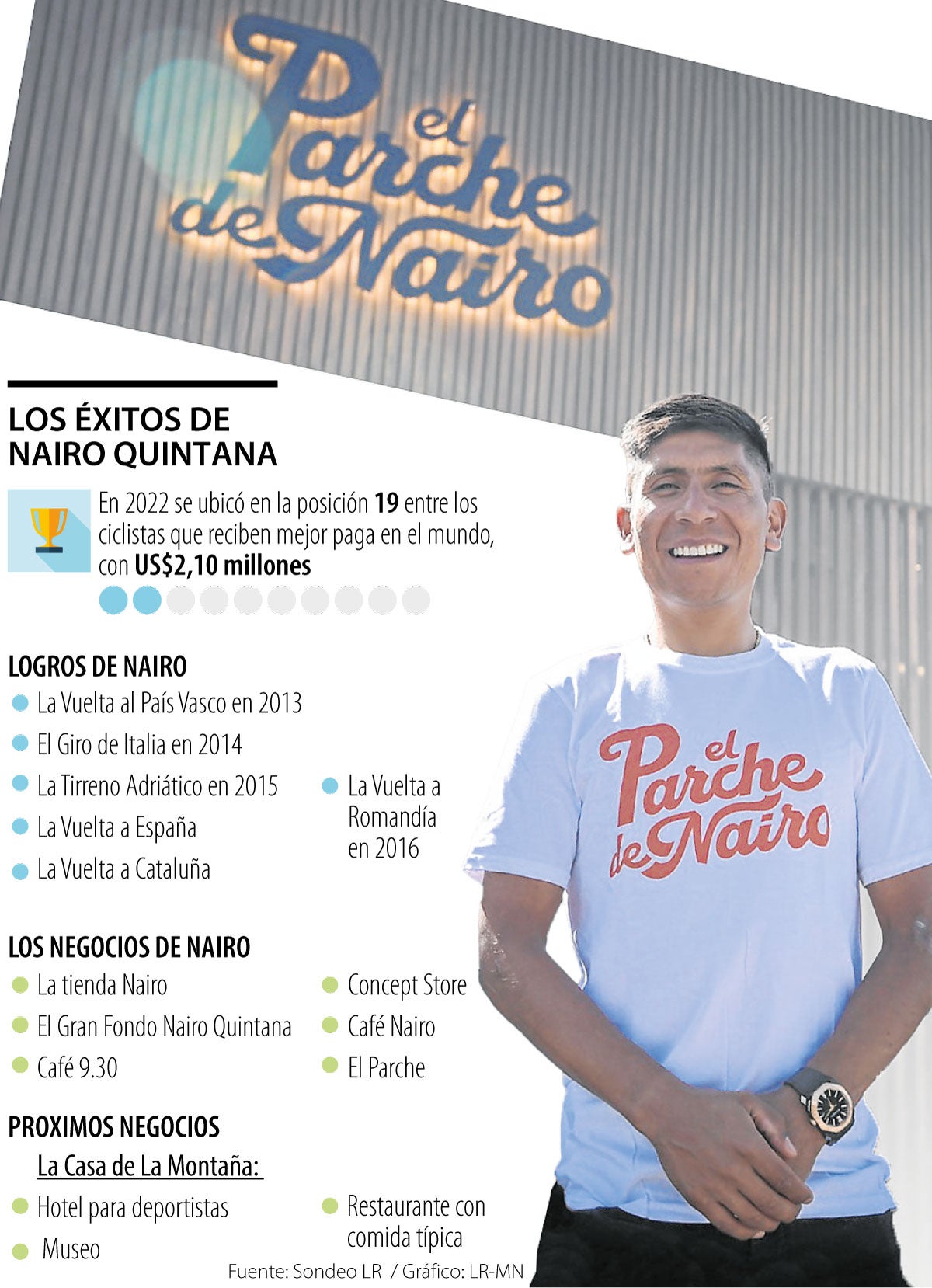 Nairo Quintana ha tenido más de 50 victorias en su trayectoria como ciclista, pero a los triunfos deportivos se suman los que ha alcanzado como microempresario, una faceta con la que ya ha montado cinco negocios en el país. Entre ellos está la Tienda Nairo, con ropa de ciclismo y casual; el Gran Fondo Nairo Quintana, nacional e internacional; Café 9.30 y Concept Store, así como su propia marca de café, Café Nairo.