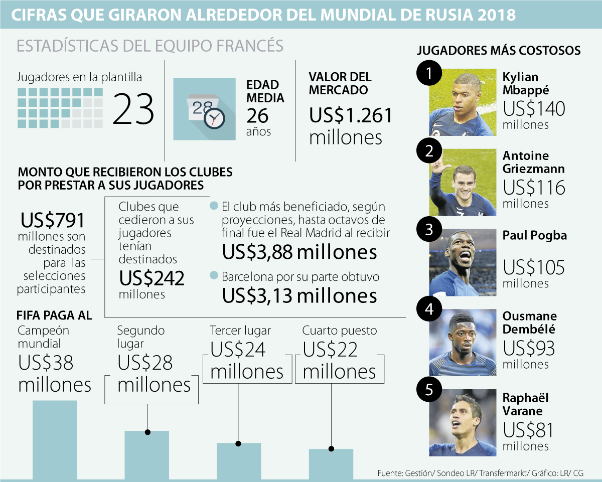 Este jugador suma ingresos anuales por US$20,4 millones; Griezmann unos US$30,3 millones; Pogba, US$25,9 millones; Dembelé, US$14 millones; y Varane, US$11,2 millones, lo que permite que hoy Francia tenga la nómina más costosa de los países participantes en el Mundial de Rusia 2018.