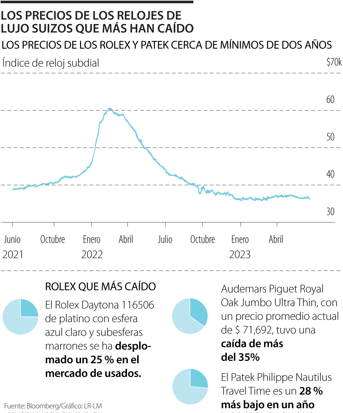 El mercado de los relojes suizos de segunda mano más lujosos del mundo se está viendo afectado por diferentes causas como la desaceleración económica, las tasas de interés más altas y la caída de las criptomonedas. Según el índice de Bloomberg, Subdial Watch , que rastrea los 50 relojes de lujo usados más comercializados por valor, está muy por debajo de los niveles de los precios alcanzados en junio de 2021.