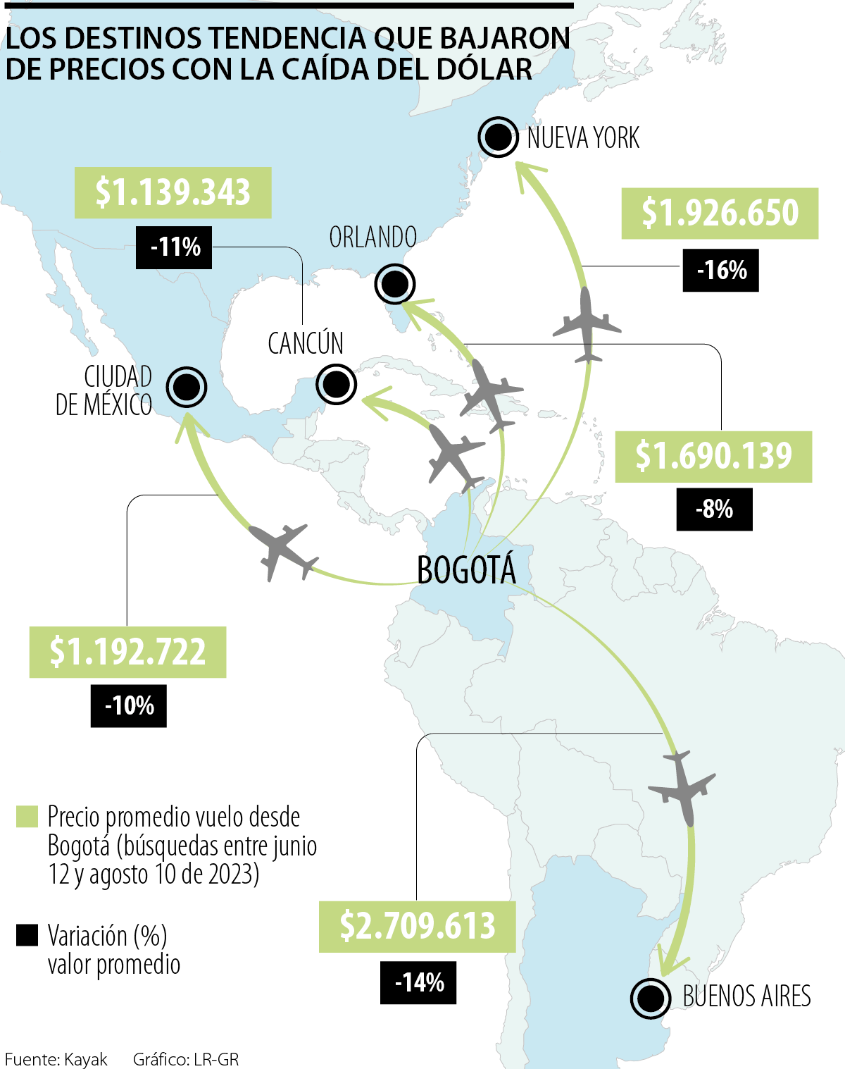 Y otros destinos del continente americano que no se ubican en Estados Unidos y que son una oportunidad para los viajeros sin visa son Cancún y Ciudad de México, que bajaron precios del tiquete en 11% y 10% respectivamente, lo que dejó ambos destinos en precios cercanos a $1,1 millones.