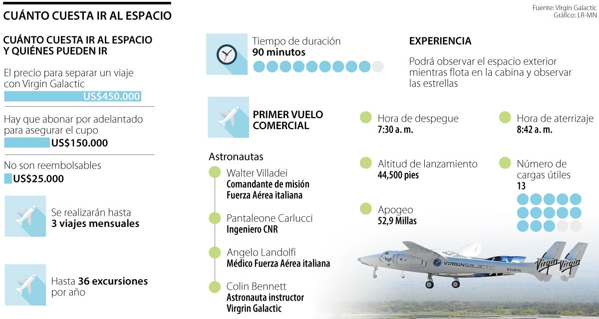 Si algún día piensa en vivir esta experiencia puede hacerlo por US$450.000. Debe ingresar a la página de Virgin Galactic y encontrará un espacio en donde puede comprar su boleto. Para apartarlo debe abonar US$150.000, de los cuales $25.000 no serán reembolsables. El viaje tendrá una duración de una hora y media. Durante este tiempo los turistas podrán observar la estrellas, la Tierra, podrán flotar en la nave y dejarse sorprender con la inmensidad del espacio.