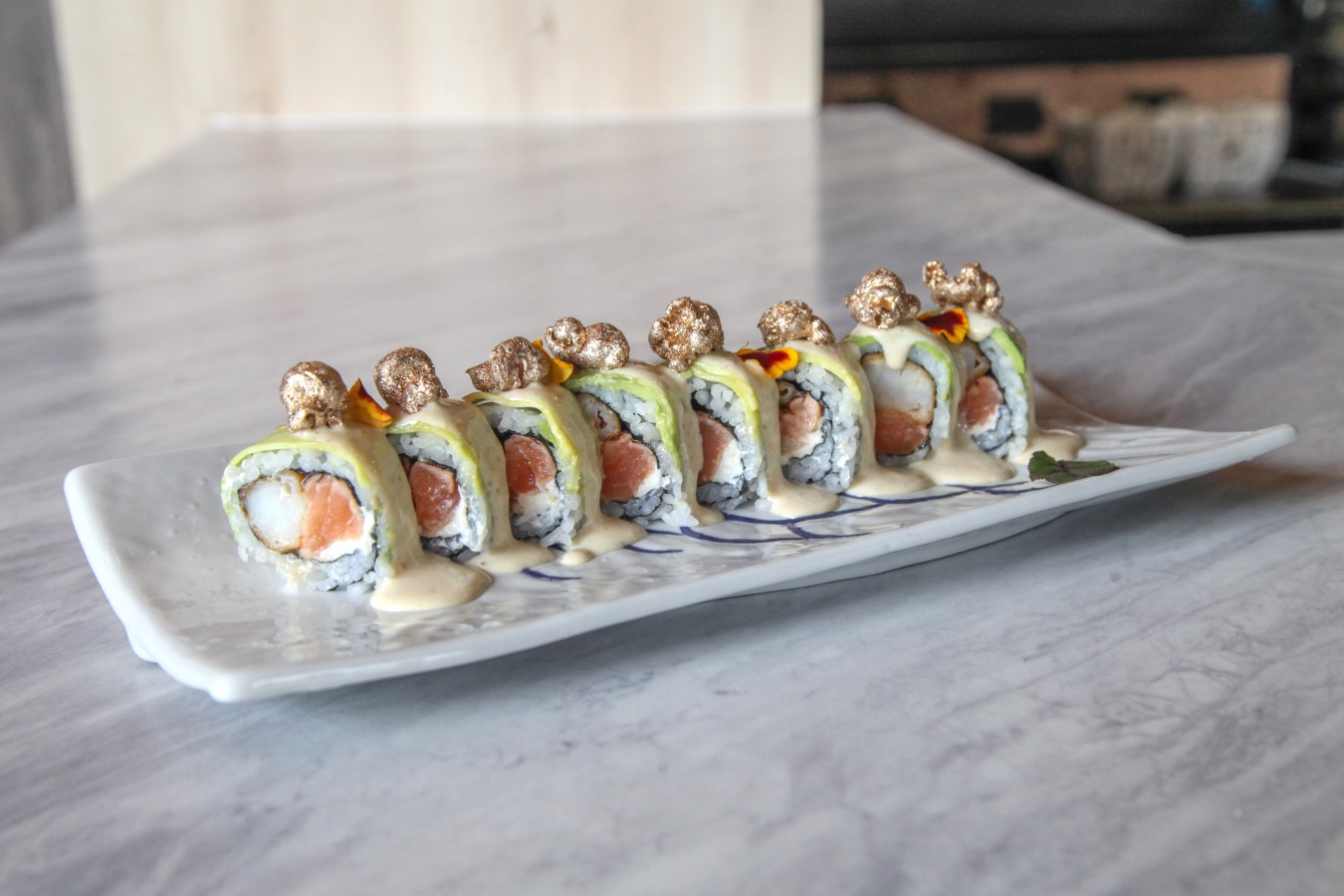 Este rollo está preparado con langostino crocante y salmón edomae (cocinado), cubierto con aguacate cremoso y aceite de trufa. Además, está coronado con maíz pira bañado en oro.