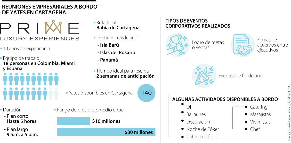 Con un presupuesto de $10 millones se puede reservar un recorrido “para altos ejecutivos, en un yate de 15 o 20 personas, e incluiría la salida a la bahía y podrían ir a las islas aledañas de Cartagena” además de las comodidades que elijan.