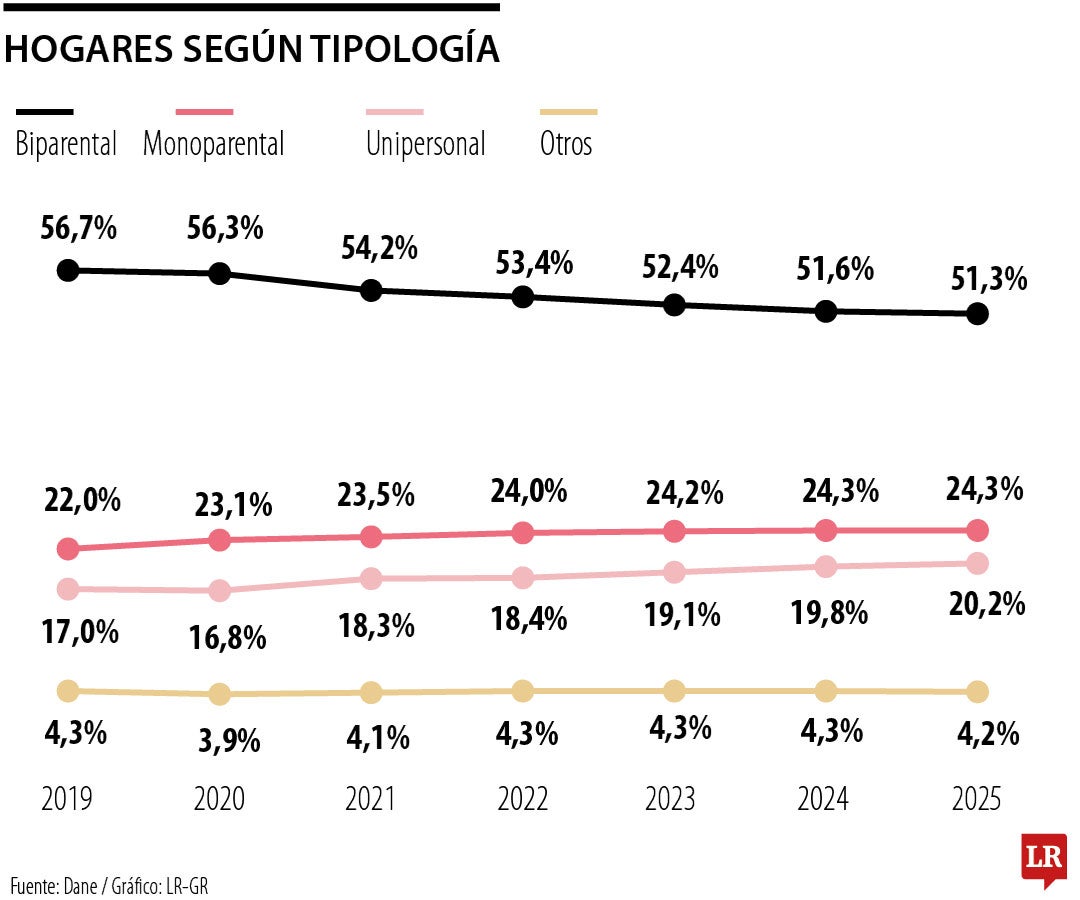 La tendencia que muestra el Dane es que “los hogares biparentales vienen cayendo y se van a convertir en la mitad de los hogares del país. Los hogares unipersonales vienen escalando y creciendo al mismo ritmo que caen los biparentales”. Si hay casi 20 millones de hogares -de mantenerse esta situación-, durante el próximo lustro serán más las casas sin hijos que aquellas en las que existen menores; más aún, habrá una participación creciente de personas solas con mascotas. Esto se suma a la transición demográfica que atraviesa el país, en la que se registraron menos nacimientos y más defunciones. Puntualmente, en 2025 se reportaron 433.678 nacimientos, 20.223 menos que en 2024, lo que representa una disminución de 4,5%.
