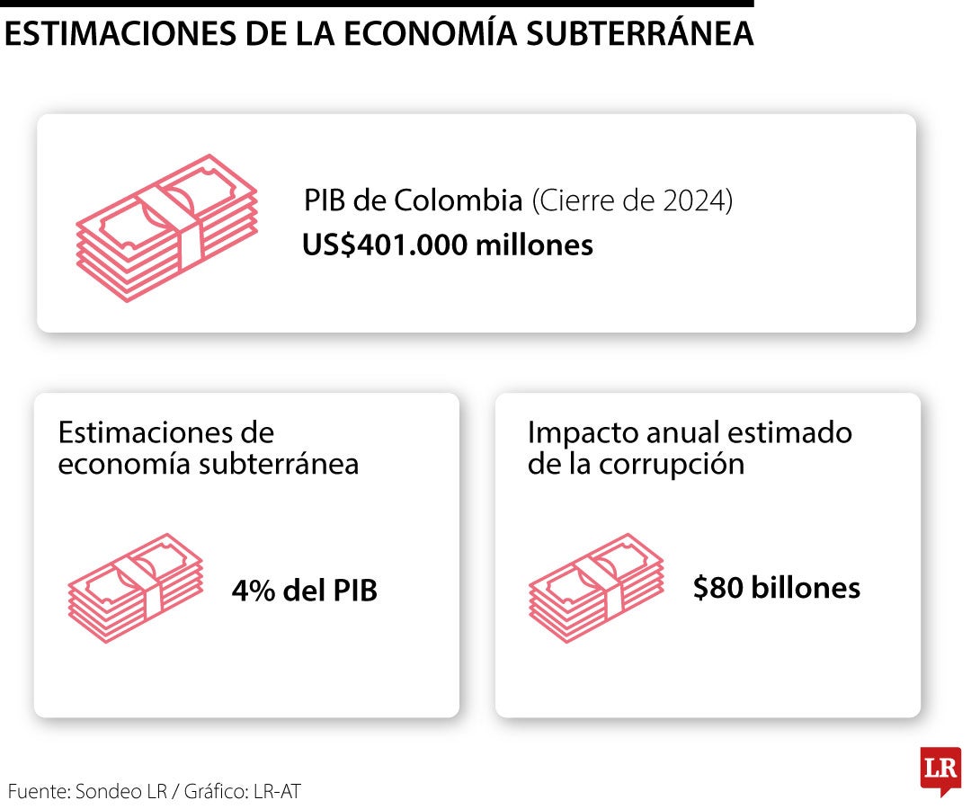 Estudios académicos, ya obsoletos, señalan que la economía subterránea colombiana pesa 4% del PIB, es decir, unos US$16.000 millones; otros sostienen que la corrupción crónica del Estado es similar a la evasión de impuestos y puede superar los $80 billones.