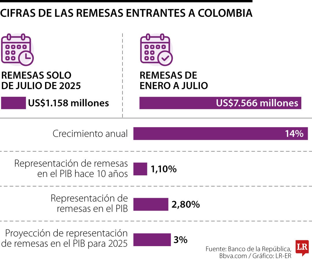 En el primer semestre de 2025 las remesas enviadas al país superaron los US$ 6.408 millones de acuerdo con el Banco de la República
