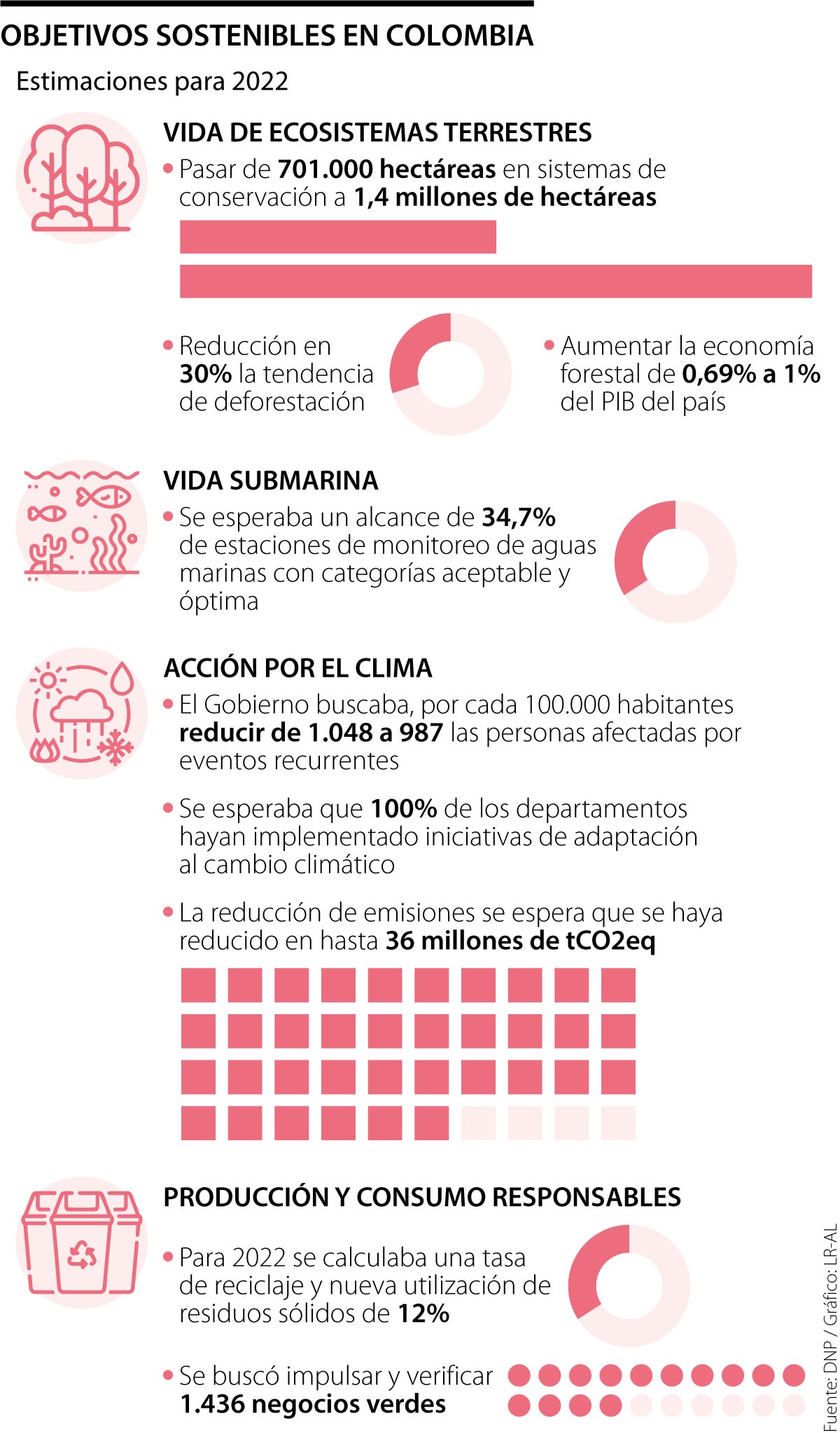Los ítems medioambientales están presentes en el plan: temas como clima, ciudades sostenibles y vida de los ecosistemas son metas para alcanzar al inicio de la próxima década y están condensados en los Objetivos de Desarrollo Sostenible (ODS). El DNP asegura que en las próximas semanas se lanzará la actualización del avance de los ODS, pero en 2022 se conoció que el plan de acción, con corte a 2021, tuvo un avance de 72% de cumplimiento.