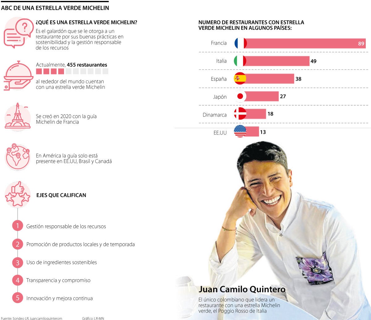 El chef ejecutivo del restaurante Poggio Rosso, Juan Camilo Quintero, es el único colombiano que cuenta con la distinción de la estrella Michelin verde. La ganó el 8 de noviembre del año pasado. El chef arribó en 2010 a Italia gracias a una beca de estudio, desde entonces se ha desempeñado en varios restaurantes de ese país. Procolombia, la agencia a cargo de promover el turismo internacional y la inversión extranjera, nombró al chef Juan Camilo Quintero como embajador de ‘Lo mejor de Colombia’.