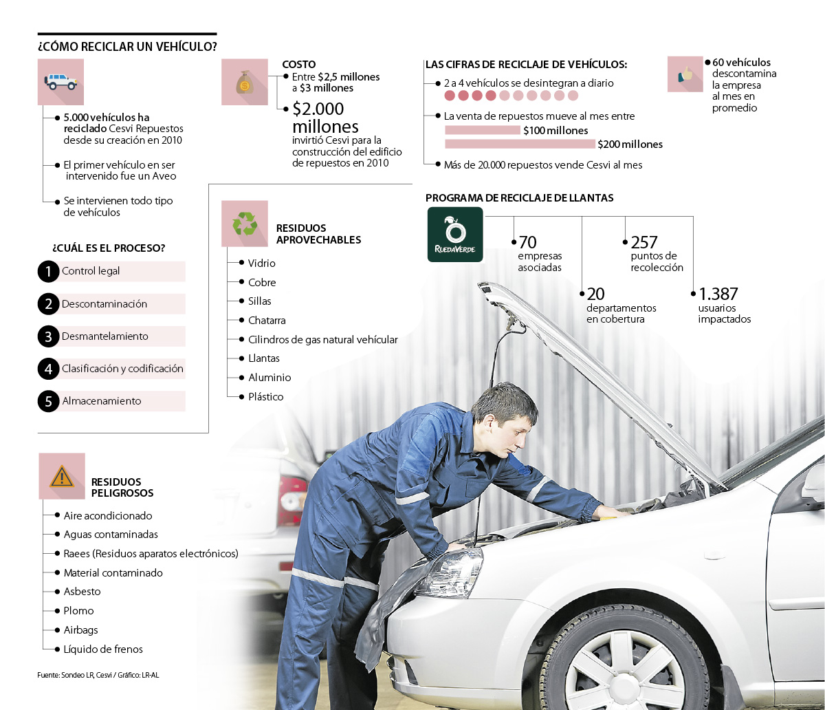 El reciclaje va más allá de convertir el plástico, el cartón y el papel en nuevos productos de materia prima. Así lo ve el Centro de Experimentación Seguridad Vial de Colombia (Cesvi), un organismo que aprovecha o reutiliza vidrios, timones y llantas de vehículos; incluso, mucho más, pues son más de 3.000 unidades o piezas las que se rescatan diariamente a la hora de desarmar un vehículo sin vida útil.