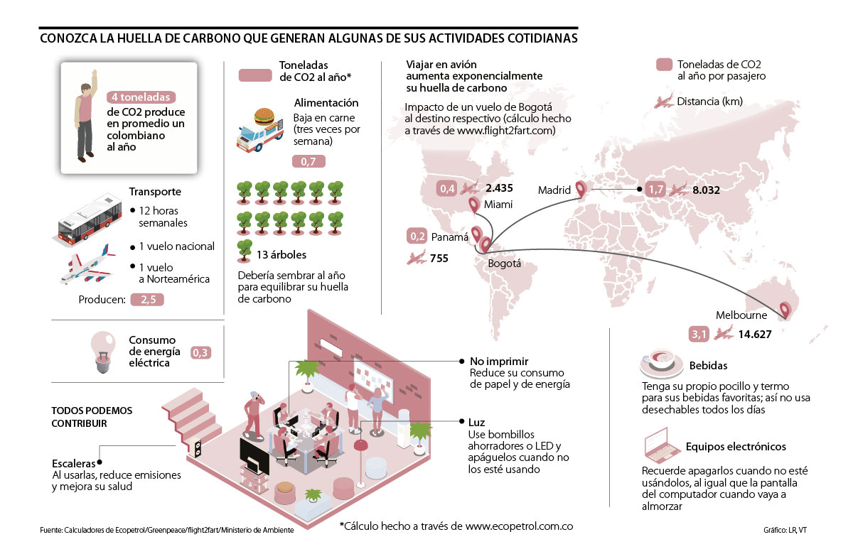 “En el día a día, realizamos actividades que dejan huella de carbono. Por ejemplo, cuando consumimos energía al prender la luz, al bañarnos con agua caliente o al mandar un correo electrónico. Una buena ida es utilizar bombillos LED o ahorradores. Además, debemos prestar atención a si la instalación de un hogar es anticuada. La alimentación también juega un papel importante. En ese sentido, si comemos mucha carne dejaremos más huella puesto que la ganadería deja más emisiones de CO2”, manifestó Juan Esteban Aristizábal, director de Servicios Ambientales de Fenalco Solidario, una corporación que tiene en su página web una calculadora de huella de carbono.