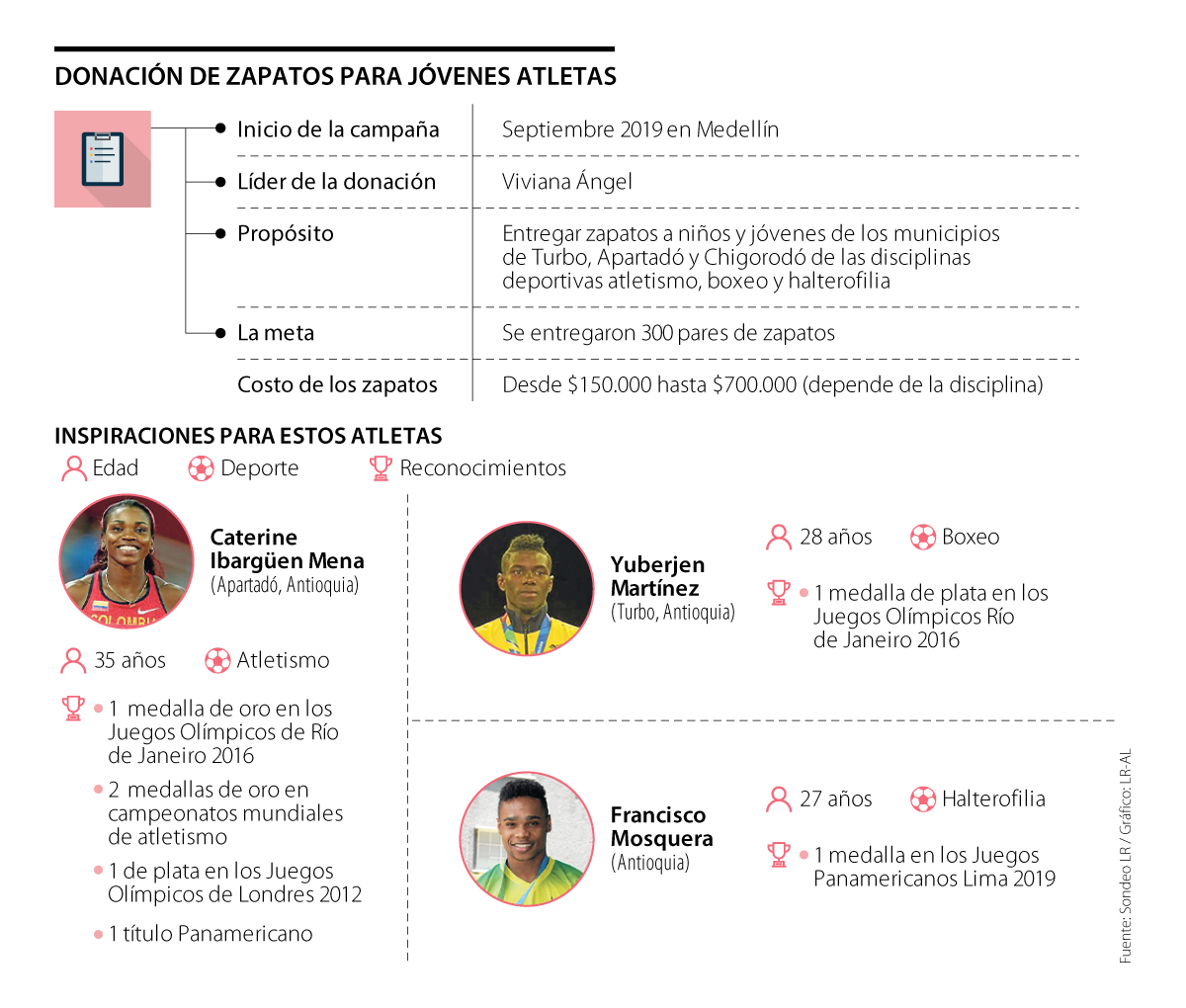 A raíz de un acercamiento con los entrenadores de algunos municipios del Urabá antioqueño y del Chocó, la abogada y politóloga Viviana Ángel inició en septiembre de 2019 una campaña personal enfocada en la recolección de calzado deportivo para niños y jóvenes atletas de esta región de Colombia.